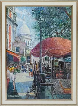 This original pastel by H. Claude Pissarro depicts a Montmartre street scene with red parasols and the white dome of a basilica in the background. Signed and accompanied by a 2006 certificate of authenticity. Artwork: 14" x 19.5", Frame: 31" x 36".This original pastel by H. Claude Pissarro captures a vibrant Montmartre street scene, featuring vibrant red parasols and the imposing white dome of a basilica in the distance. The artwork is signed and accompanied by a 2006 certificate of authenticity, ensuring its provenance and authenticity. Dimensions: 14” x 19.5” (artwork), 31” x 36” (frame).