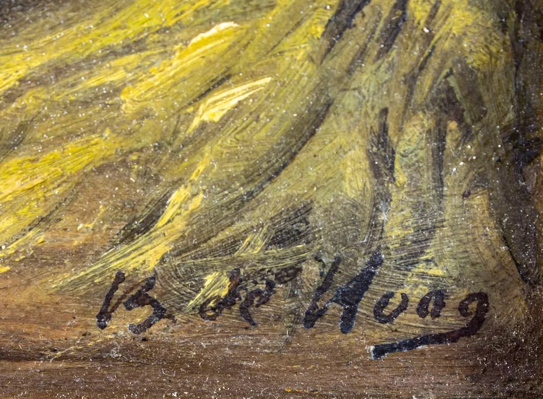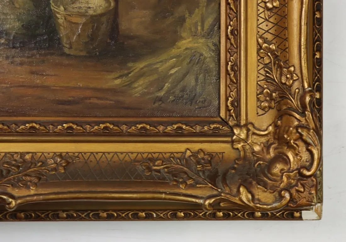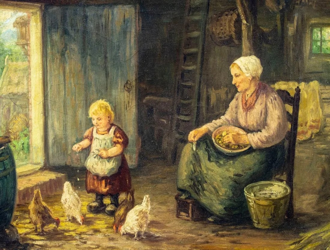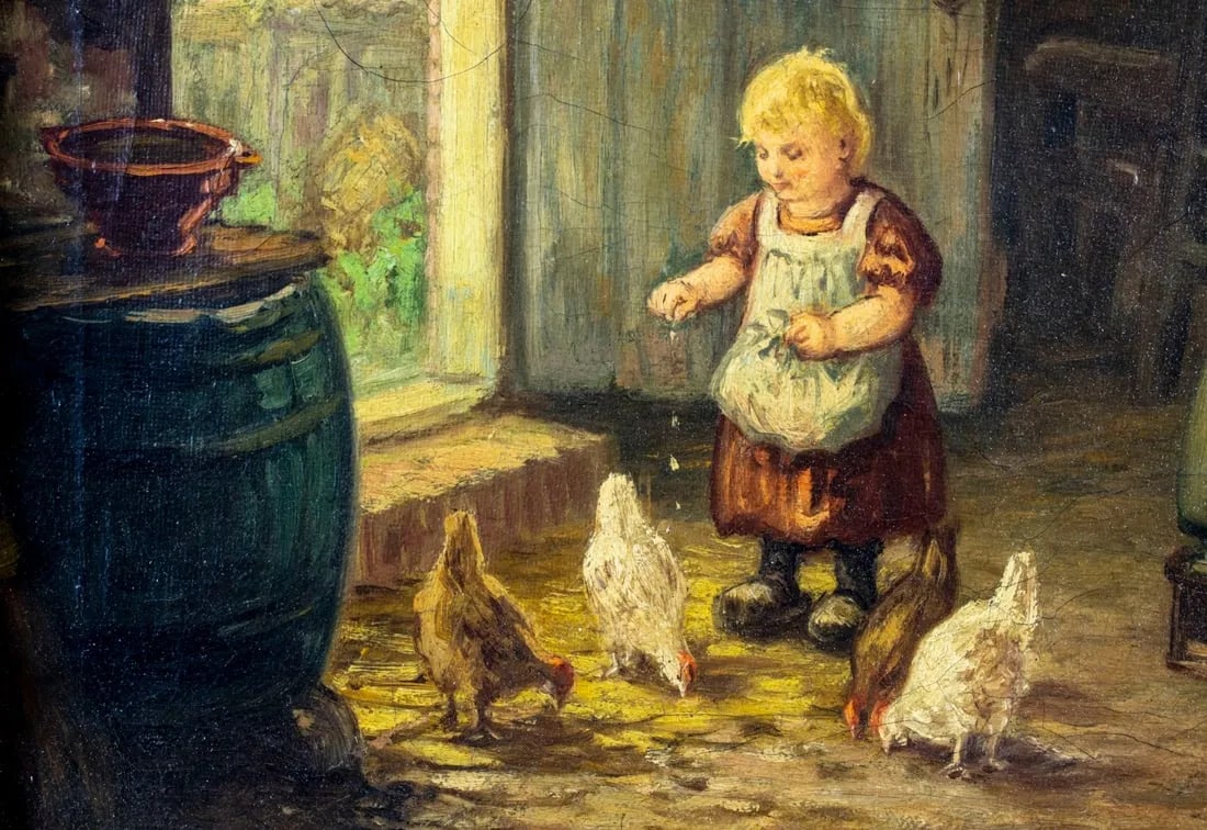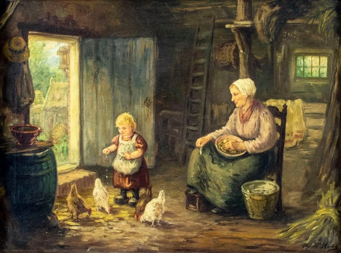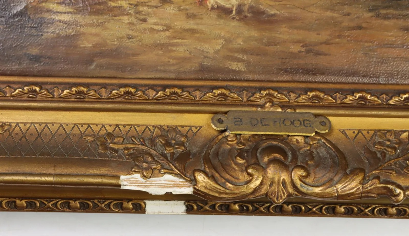 Bernard De Hoog was a genre and portrait painter. Born in Amsterdam in 1866, De Hoog occupies a distinguished place among the masters of Holland modernism. As well as having lived and worked in Amsterdam, Laren, Haarlem, Bussum, and The Hague, De Hoog studied under J.F. Hulk and J.C. van Essen at the Quellinus school in Amsterdam. His paintings, often interiors with figures, were readily exported to the US, Canada, and England. De Hoog died in The Hague in 1943. Artists of The Hague School worked in Holland from around 1860 to 1900. Like the French Barbizon School, these artists turned away from academic themes based on history or mythology. Instead they made realistic depictions of their immediate surroundings, including rural landscapes, peasant life, beach scenes, and, occasionally, urban streets. They were sensitive to the effects of light and atmosphere, recalling the great tradition of 17th-century Dutch landscape painting. Among the leaders of The Hague School were Jozef Israels, Willem and Jacob Maris, Hendrik Willem Mesdag, Paul J.C. Gabriel, Bernard J. Blommers, Hendrik J. Weissenbruch, Johannes Bosboom, Willem Roelofs, Anton Mauve and David A.C. Artz. De Hoog was especially noted for his scenes with children and country life with peasants.