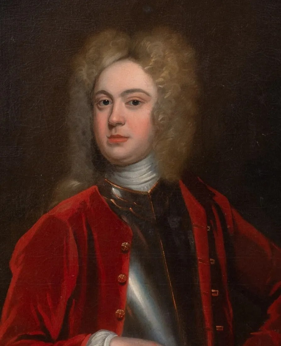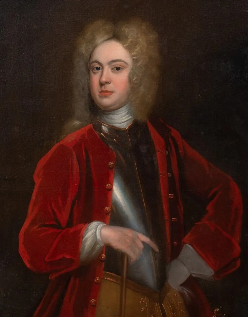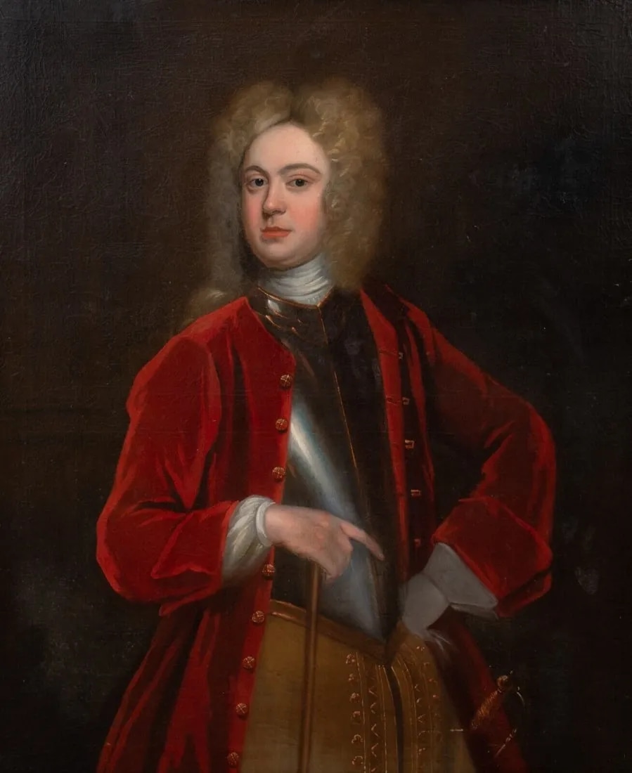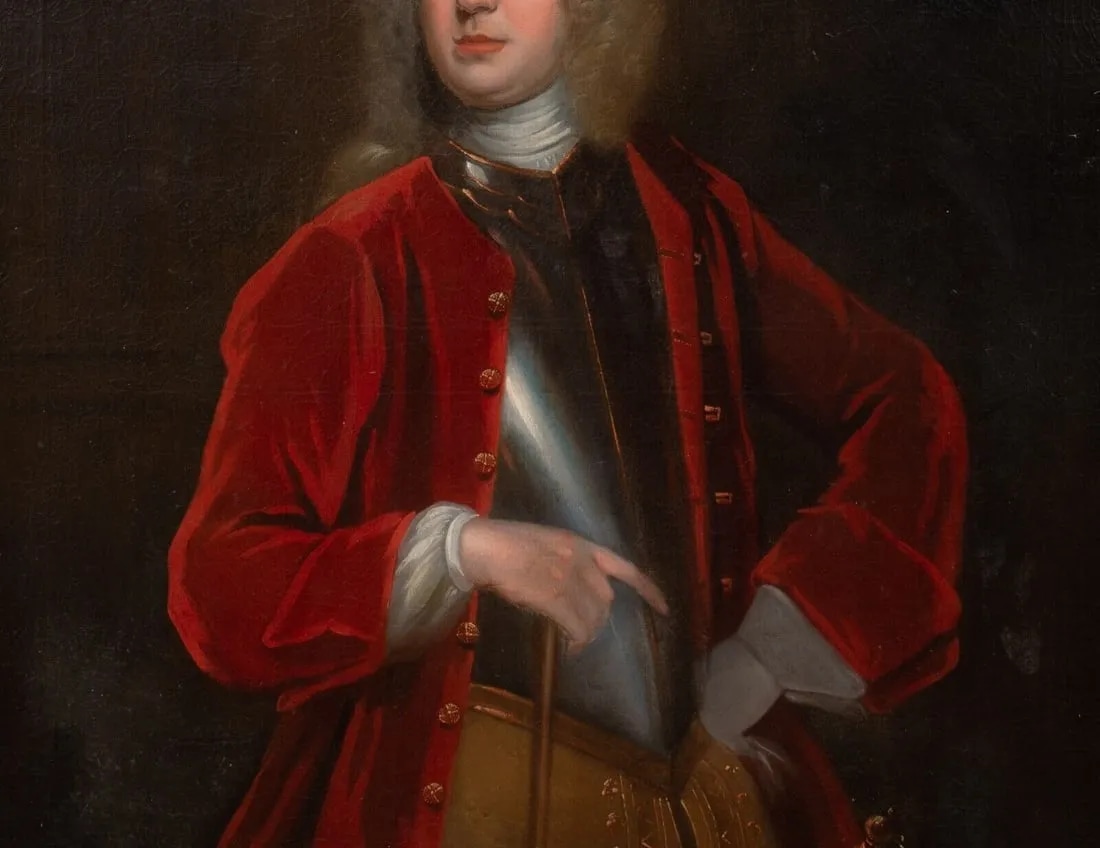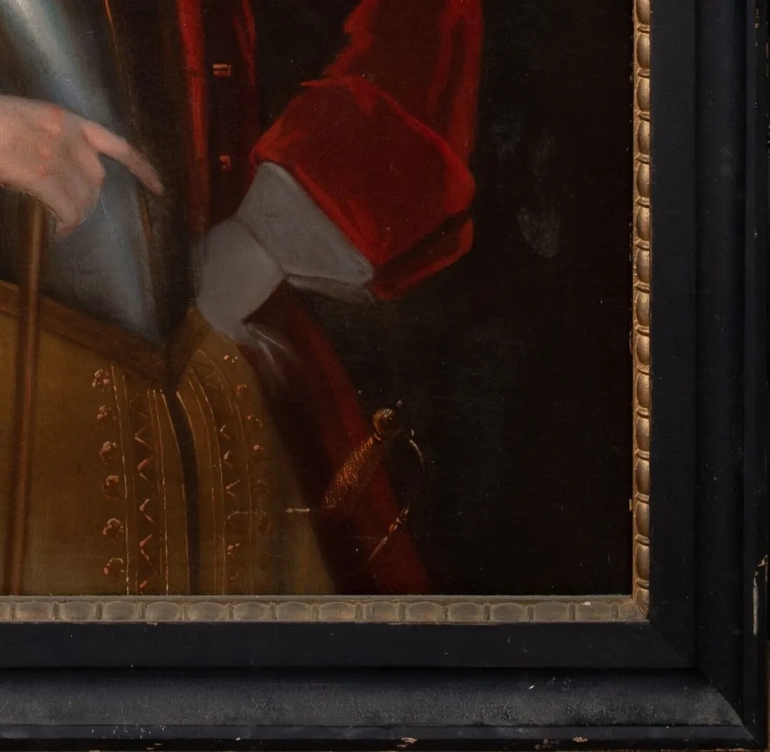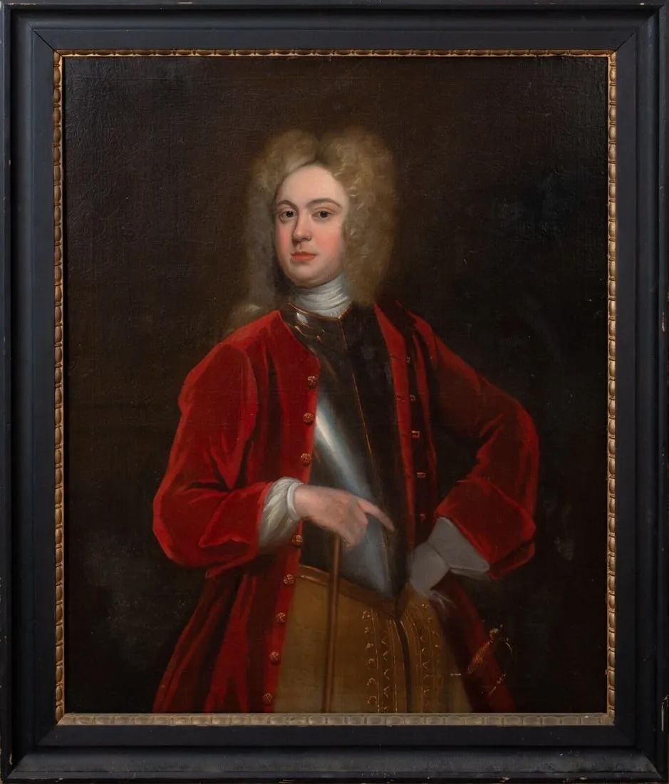 Large oil on canvas portrait of Robert Walpole as Secretary of War, dated to around 1708, from the Sir Godfrey Kneller workshop. Stunning three-quarter length image of the illustrious statesman who served as de facto prime minister and held the positions of secretary of war, chancellor of the exchequer, leader of the house of commons, and Chancellor of the Exchequer. Walpole is depicted with the scarlet jacket and ornamental breastplate typical of the Secretary of War office, which he held until 1710. Verso of frame has an identification plaque. 52" x 44" framed