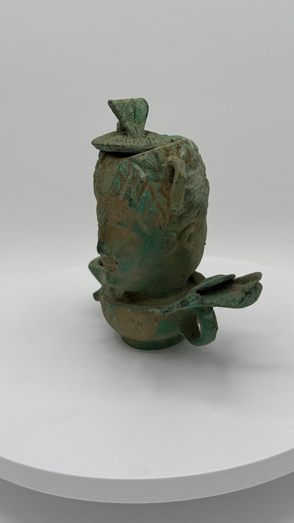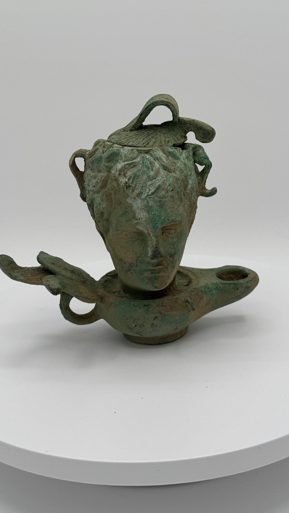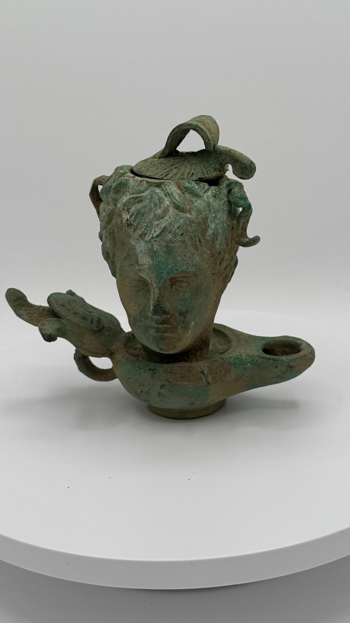 A Roman Bronze Oil Lamp circa 1st/2nd Century A.D. made in the form of a double sided roman male with his full curly locks on display. ring on side to facilitate hanging..