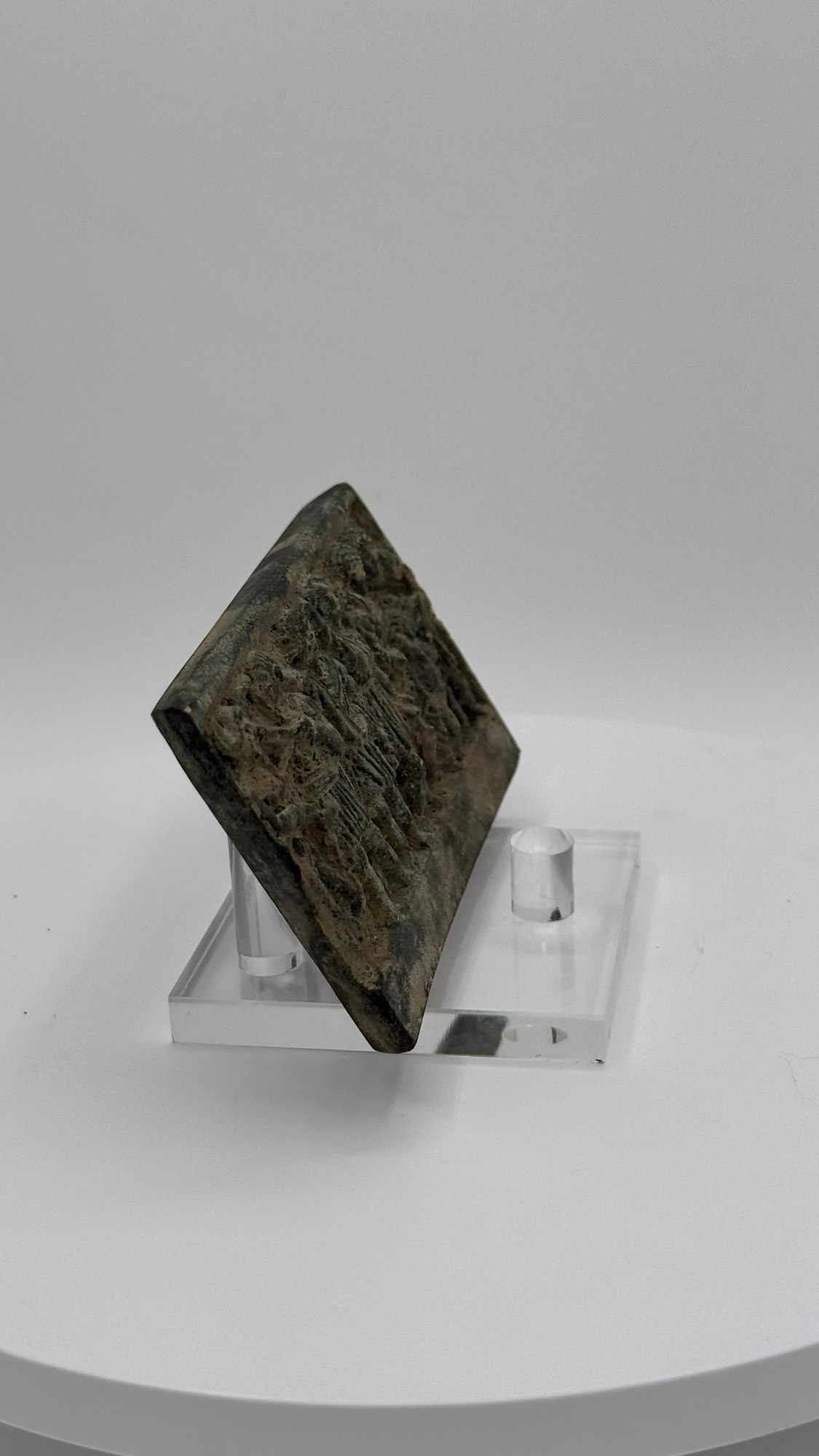 The plaque has what is believed to be a partial inscription and multiple figures. Many military and civilian pieces alike were engraved in this style, unless the material was softer at which time it could be "scratched" onto the surface. This item is partially corroded.