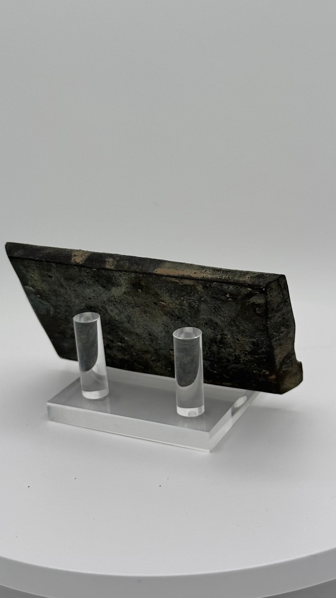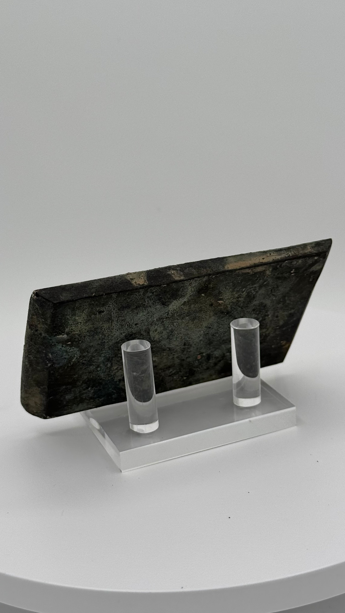 A bronze votive plaque This plaque has a rectangular center section with an engraved border, followed by two end portions, with incised lines at the end. It is believed this was part of a larger piece.These plaques were of religious significance and used in rituals.