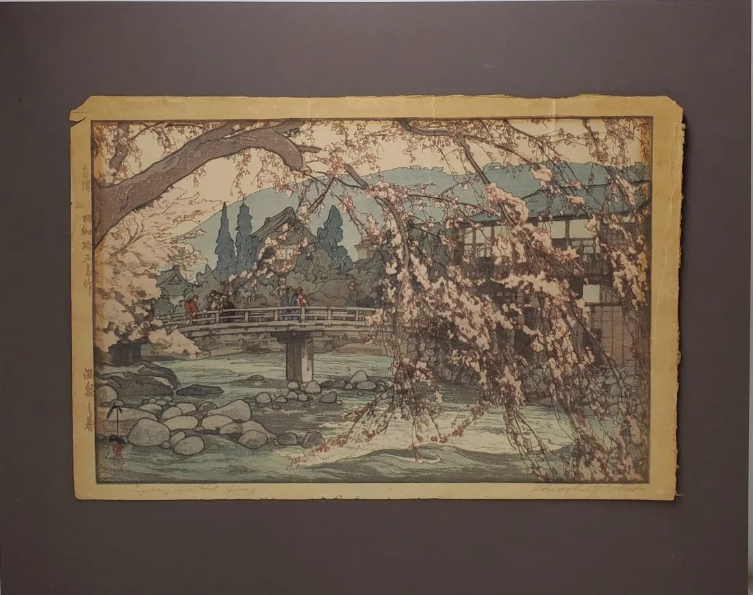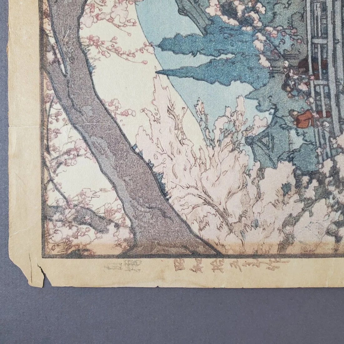 In 1920, at the age of 44, Yoshida presented his first woodcut at the Watanabe Print Workshop, organized by Shōzaburō Watanabe (1885–1962), publisher and advocate of the shin-hanga movement. His first work was a print depicting the Meiji Shrine. In 1921, he produced seven prints, including a series of sailing ships. However, Yoshida's collaboration with Watanabe was short partly due to Watanabe's shop burning down because of the Great Kanto earthquake on September 1, 1923.[2]
