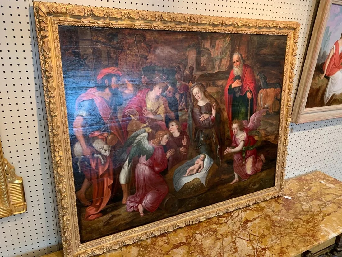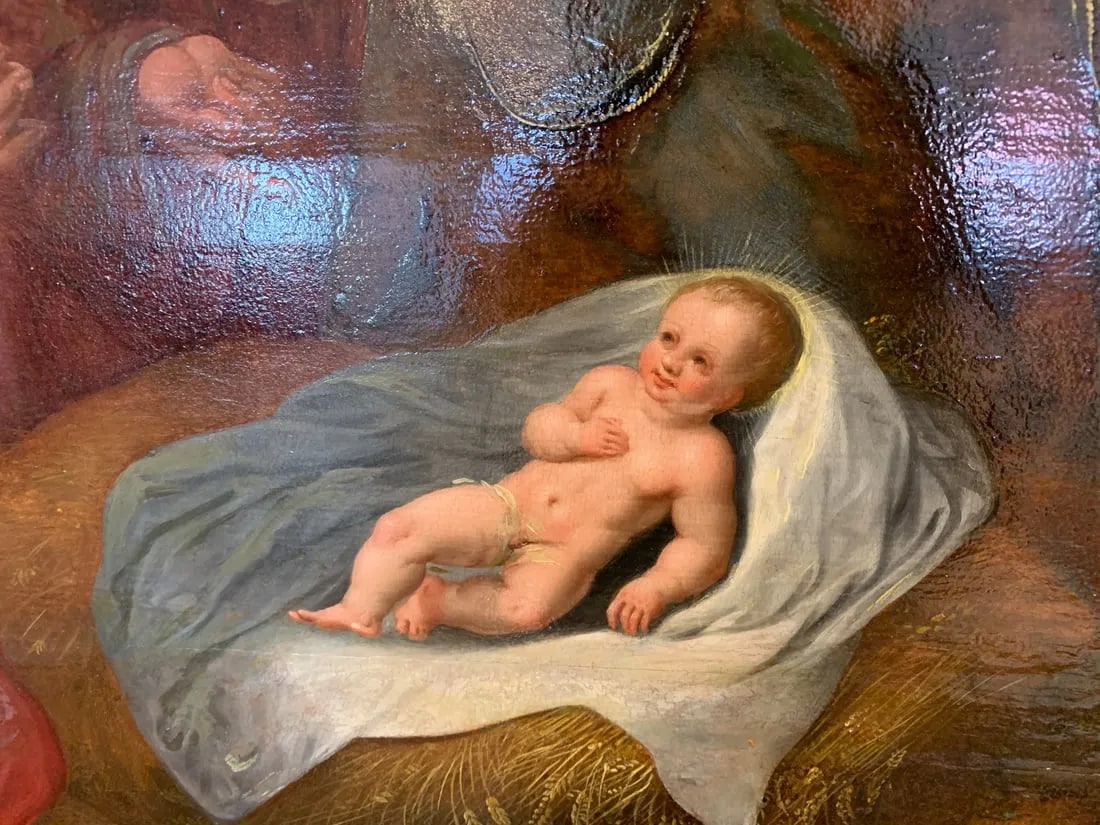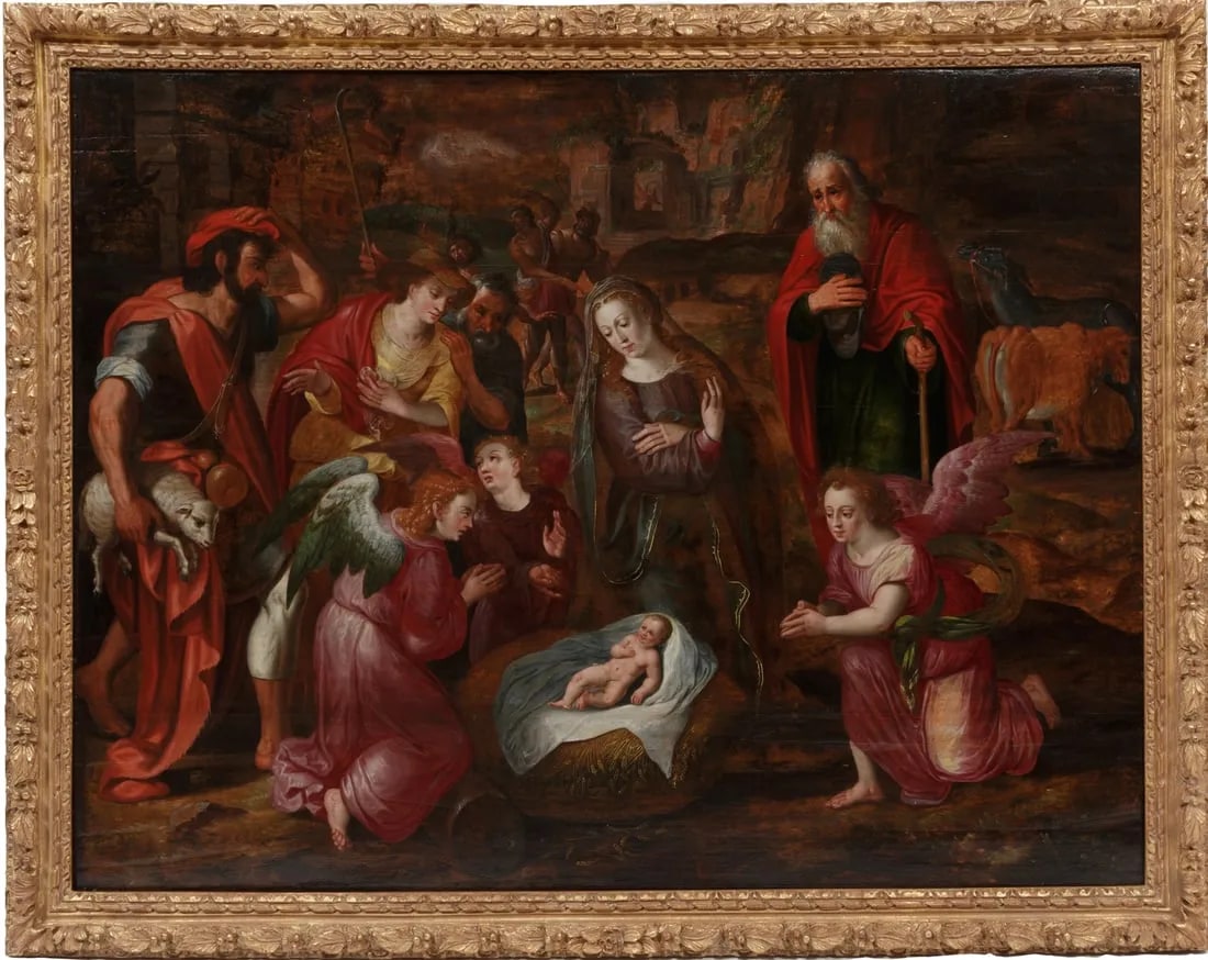 In this painting Van Noort utilized his considerable skills to bring to life the Adoration of the Shepherds theme, simply the depiction of shepherds paying homage to the newborn Christ, an event described in The Gospel According to Luke.