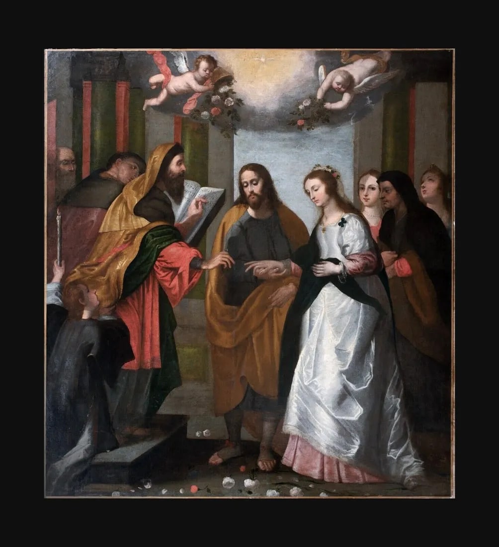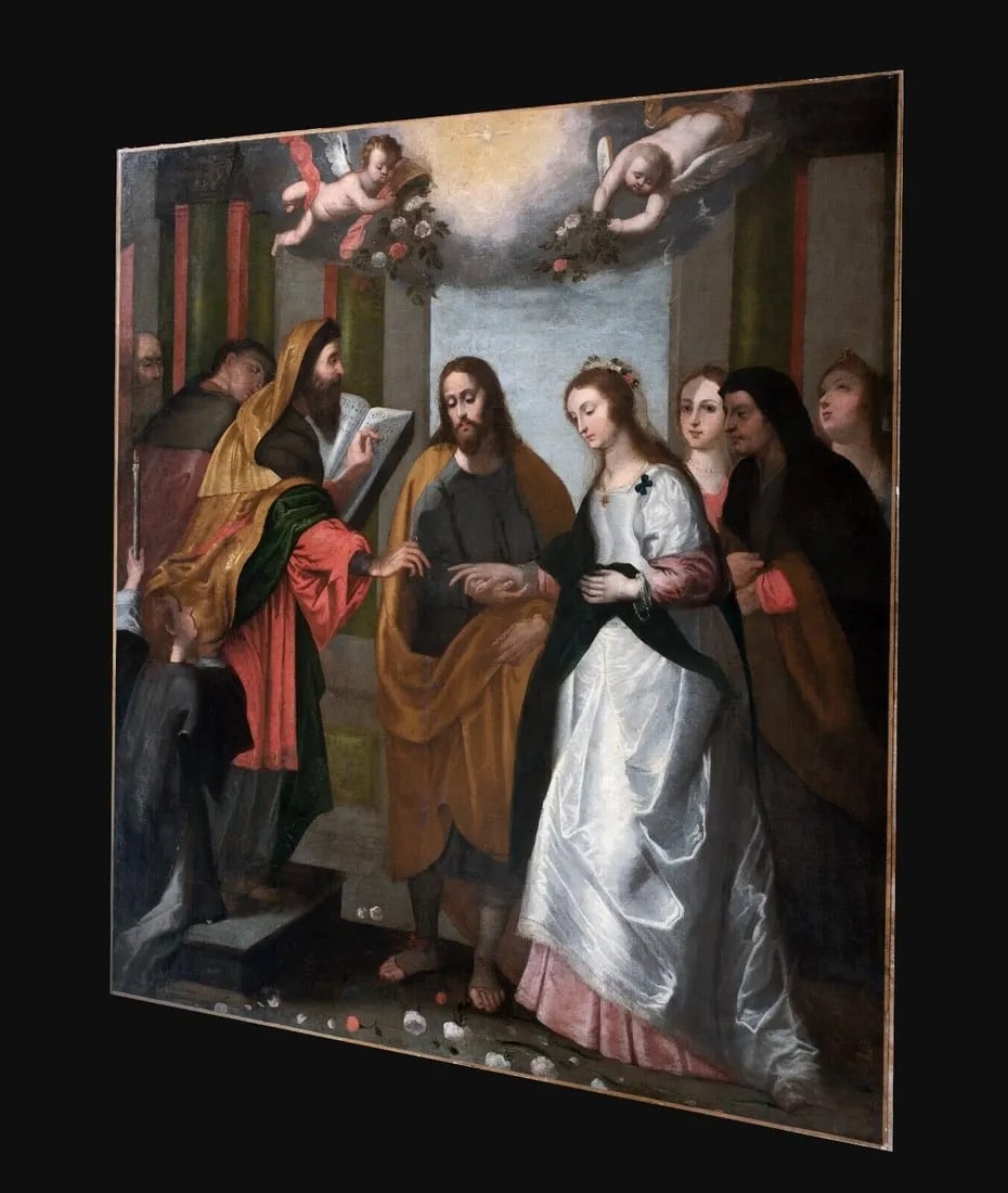 The Marriage Of The Virgin, 17th Century Workshop of Peter Paul Rubens (1577-1640) - Huge 17th century Dutch painting depicting the wedding of the Virgin, oil on canvas. The large-scale deception of the Marriage of the Virgin is closely linked to Rubens and his workshop. Frameless. Excellent condition for its age with some touch ups but no significant damage or restoration. This work is closely related to Rubens who made the design of the engraving of Schelte a Bolswert (1586-1659) which is almost identical. Provenance: A private London collector Dimensions: 82" x 77" without frame approximately