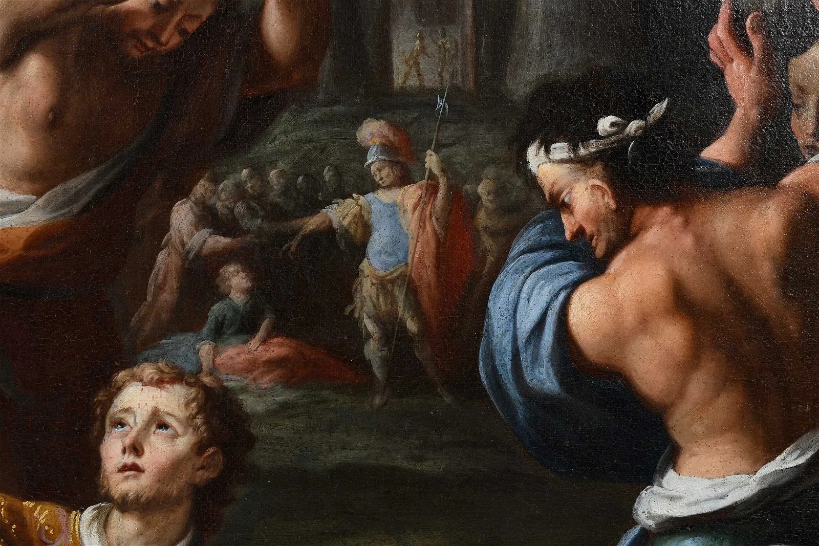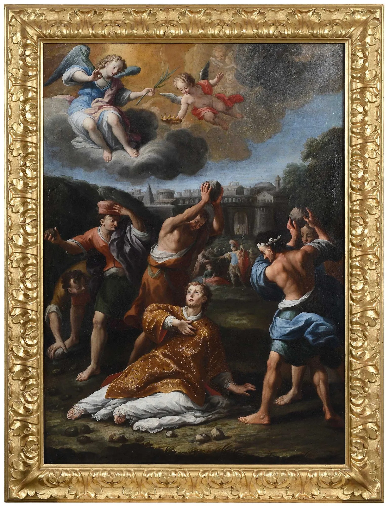 The Martyrdom of St. Stephen, 17th century, oil on linen, 53-3/4 x 38-1/8 in.; fine gilt wood Florentine leaf frame, 62-1/2 x 48 x 2-3/4 in.