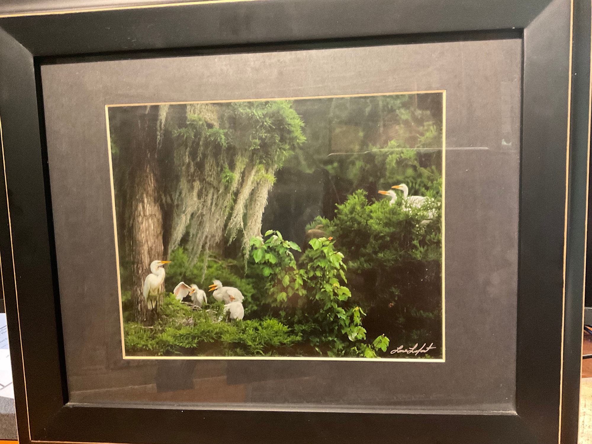 Stunning colorized photo of the deep Louisiana swamps with a gathering of wind birds set in the lush green of the area with whisks of moss hanging forma n ancient tree cover.