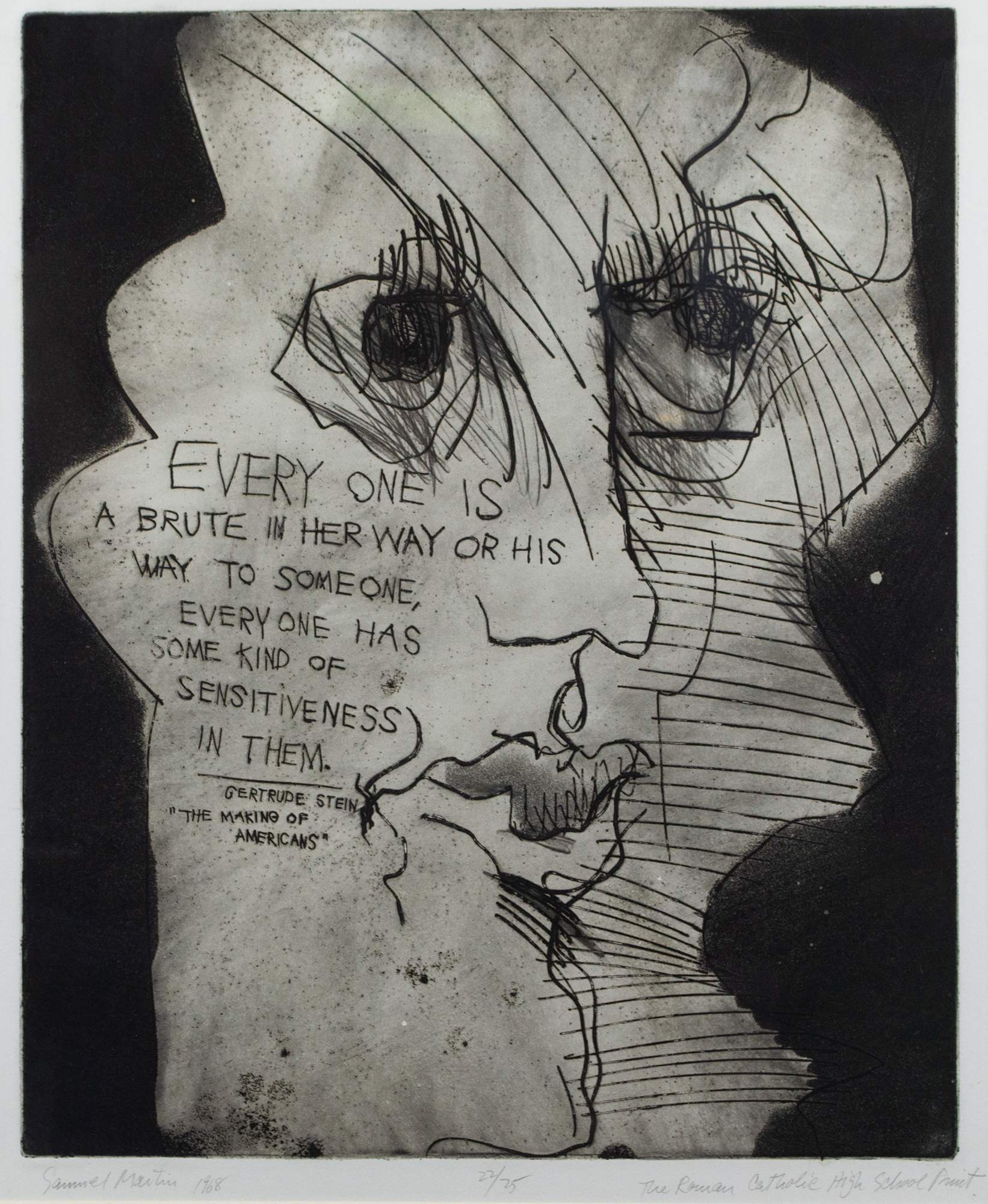- Signature: Signed and dated "1968" at lower left, edition numbered 22/25 and inscribed at lower right to "The Roman Catholic High School Print". "gift to bdb by students of r.c.h.s. june/1968 in connection with show of jb" verso