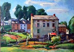 Subject is a group of houses in landscape. Painted in fluid juicy colors of greens, yellows, blues, reds, oranges, purples, and browns