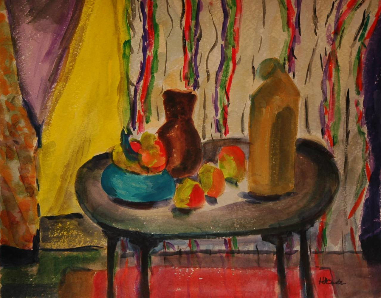 - Still Life Of Bottles And Fruit On Table