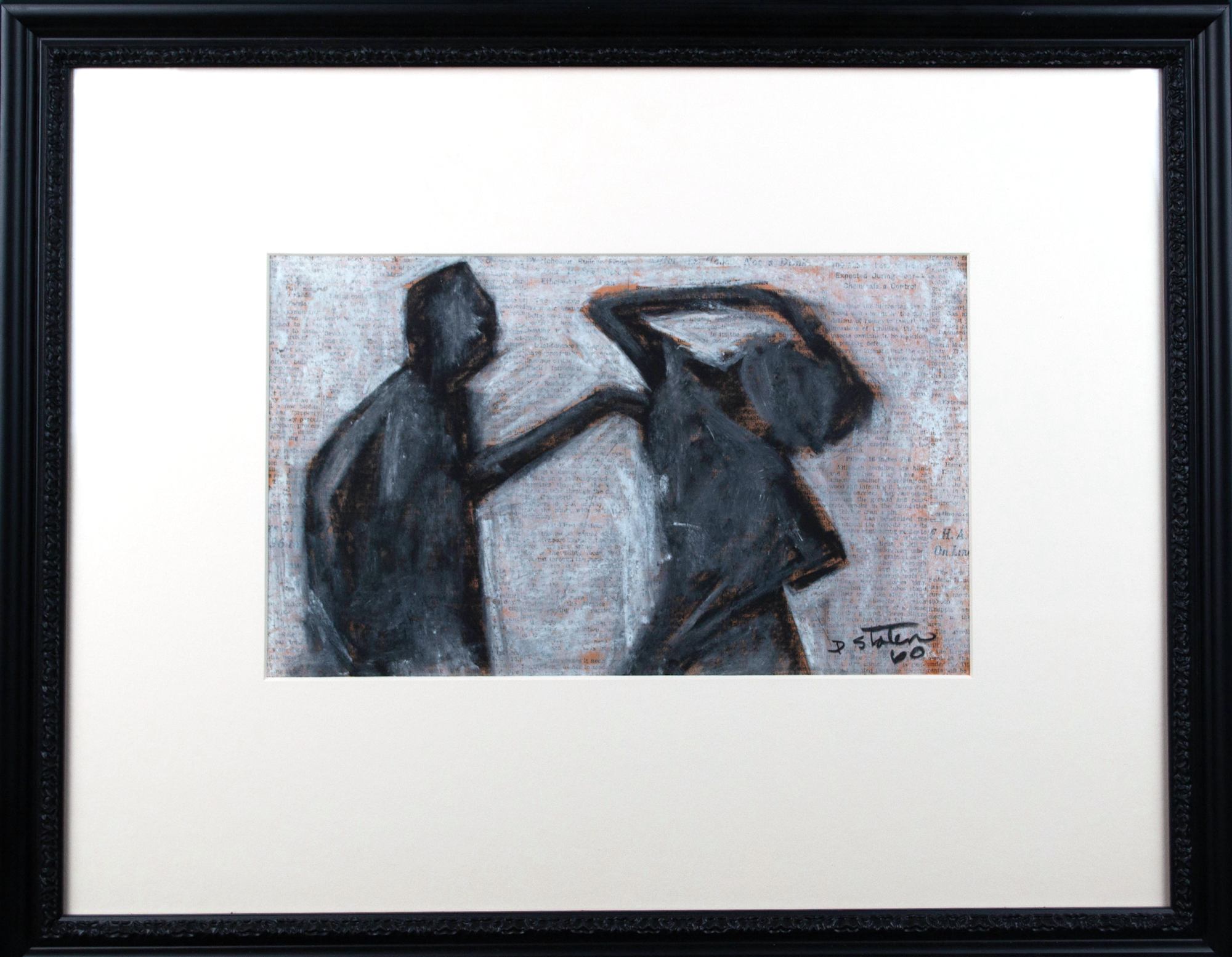 Abstracted oil-painted silhouettes of a couple in a sultry embrace layered on top of a newspaper.