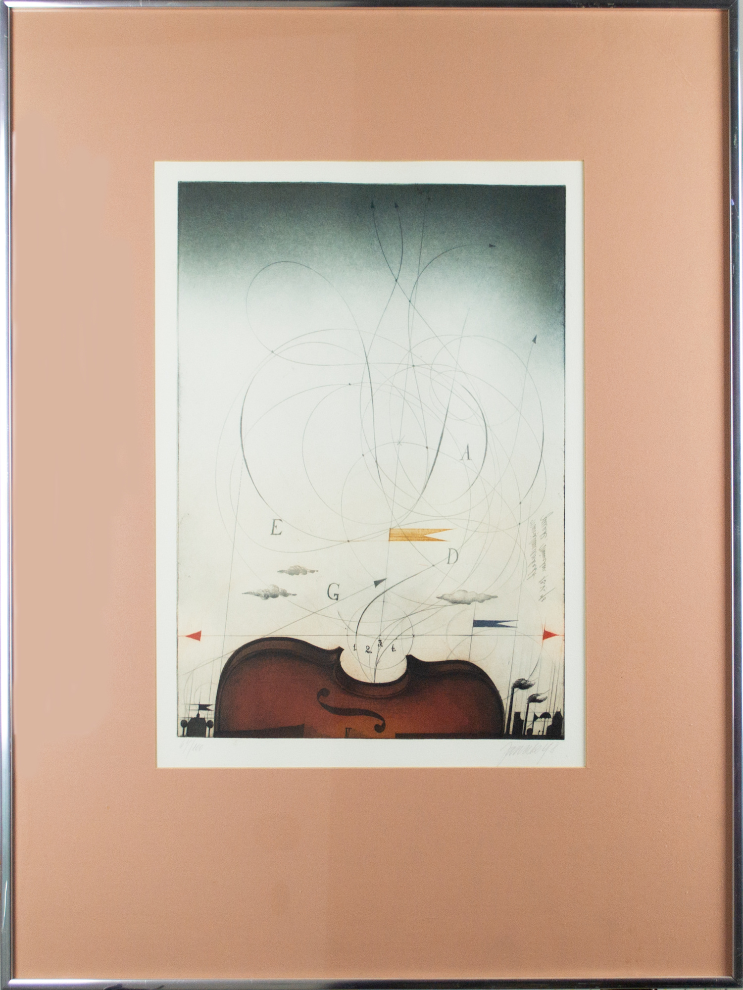 Half a violin, flag and circles, floated in a metal frame