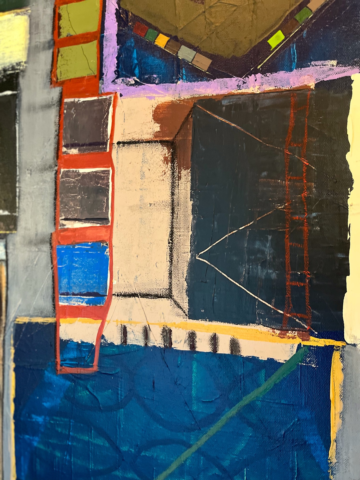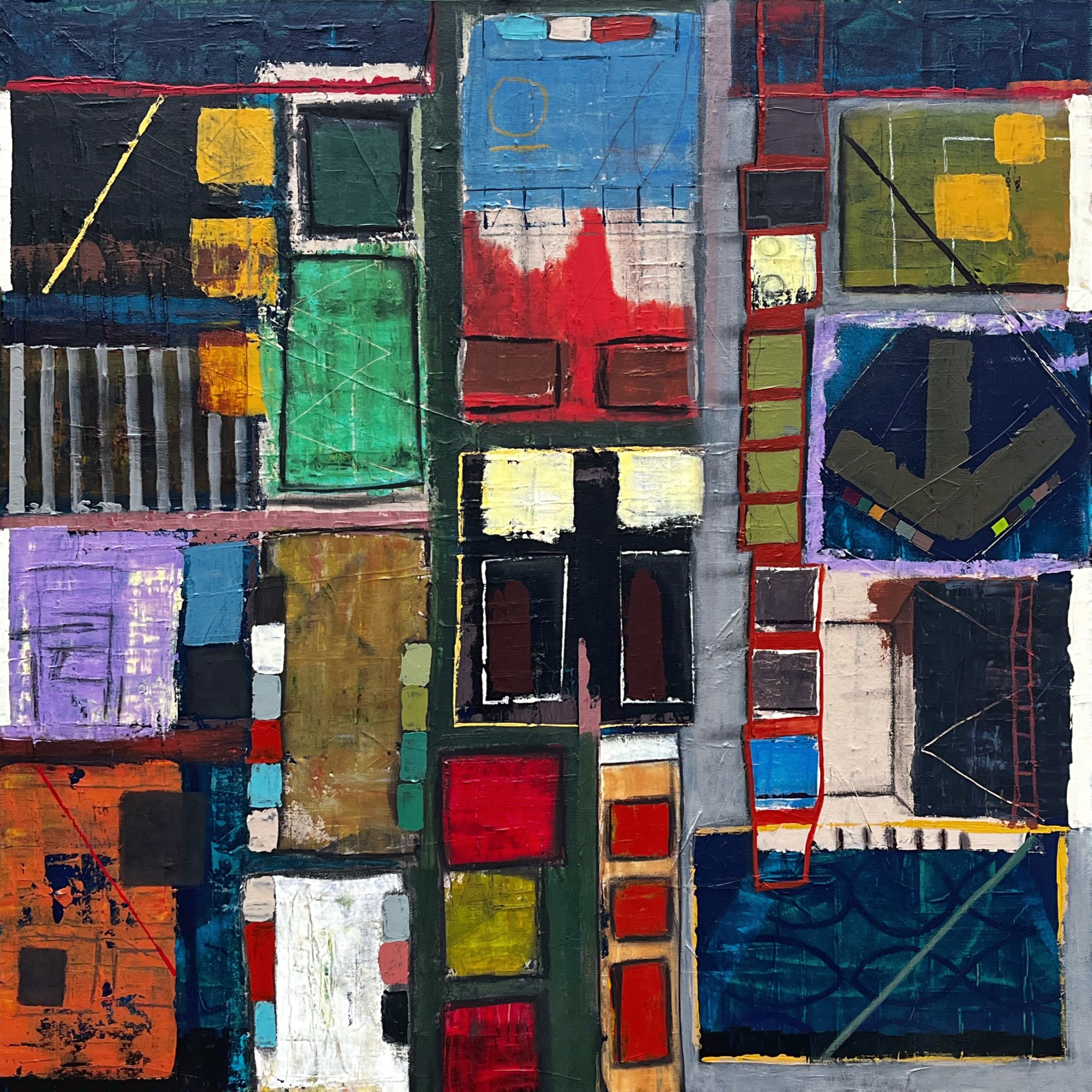Acrylic, oil pastel, and charcoal on canvas.