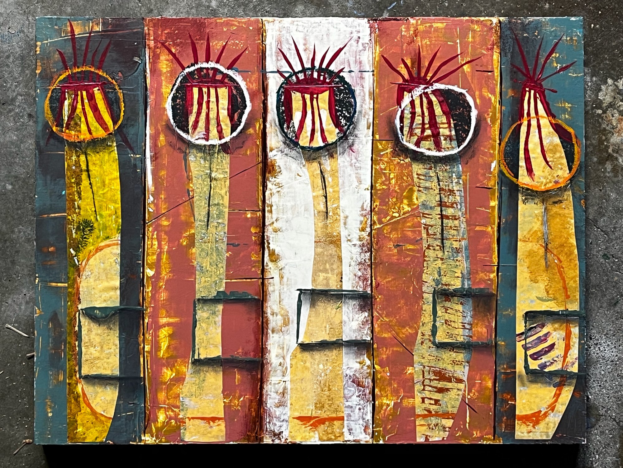 Acrylic, charcoal, plastic grocery bag, on cradled wood panel.