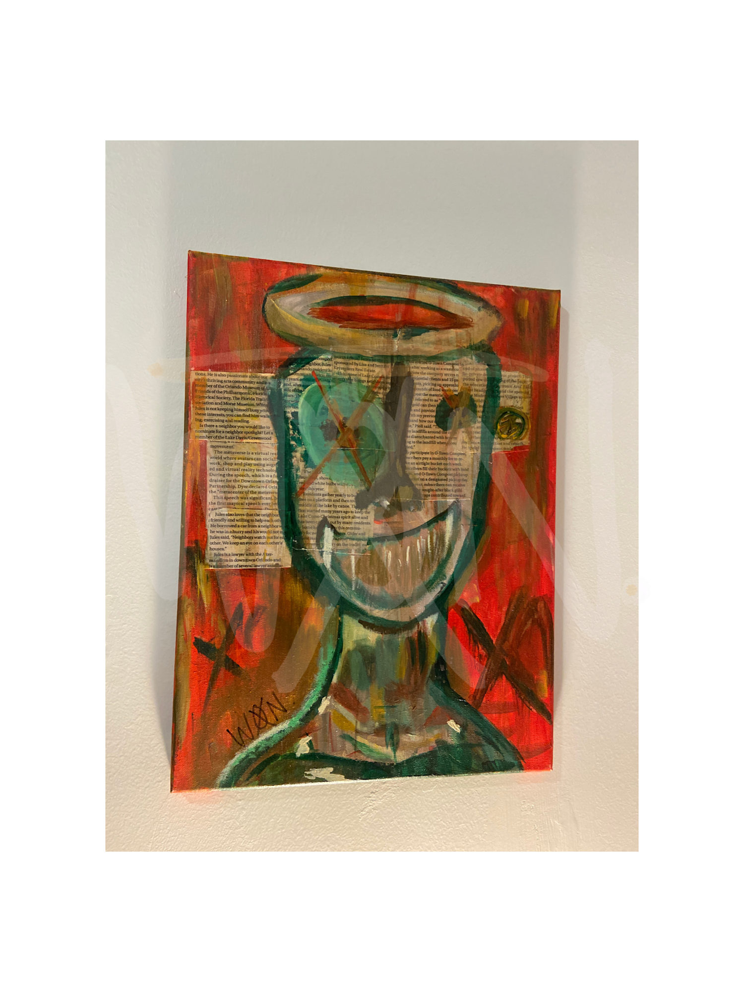 RUMOR HAS IT captures the personal experience of vulnerability turned against oneself, exploring the impact of betrayal and gossip. The figure, with an exaggerated smile and a halo, appears to represent innocence or honesty, while the fiery red background and crosses evoke a sense of anger and conflict. The collaged text emphasizes the weight of words and how they can be weaponized. This work reflects the emotional toll of sharing intimate details, such as a common health condition, only for them to be used in malicious ways by those who are ironically affected by the same thing. Through bold, expressive strokes and layered textures, the piece confronts the painful reality of rumors and the necessity of cutting toxic people out of one's life. (you can't bully me.)