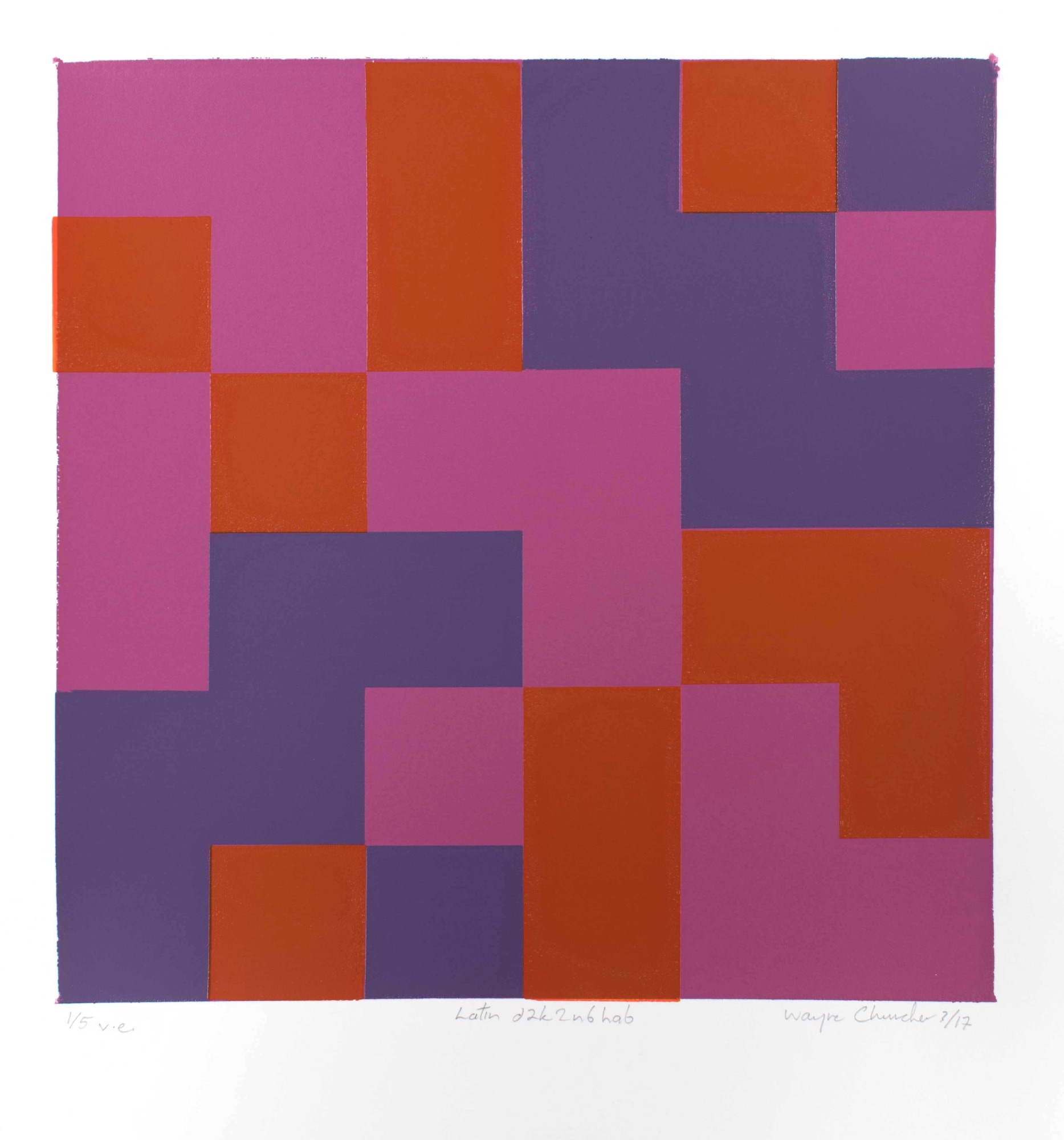 A layered paper stencil screen print. 'Design' is by computer program, so there are no planned aesthetic concerns. Instead, this work refers to process of its own making.