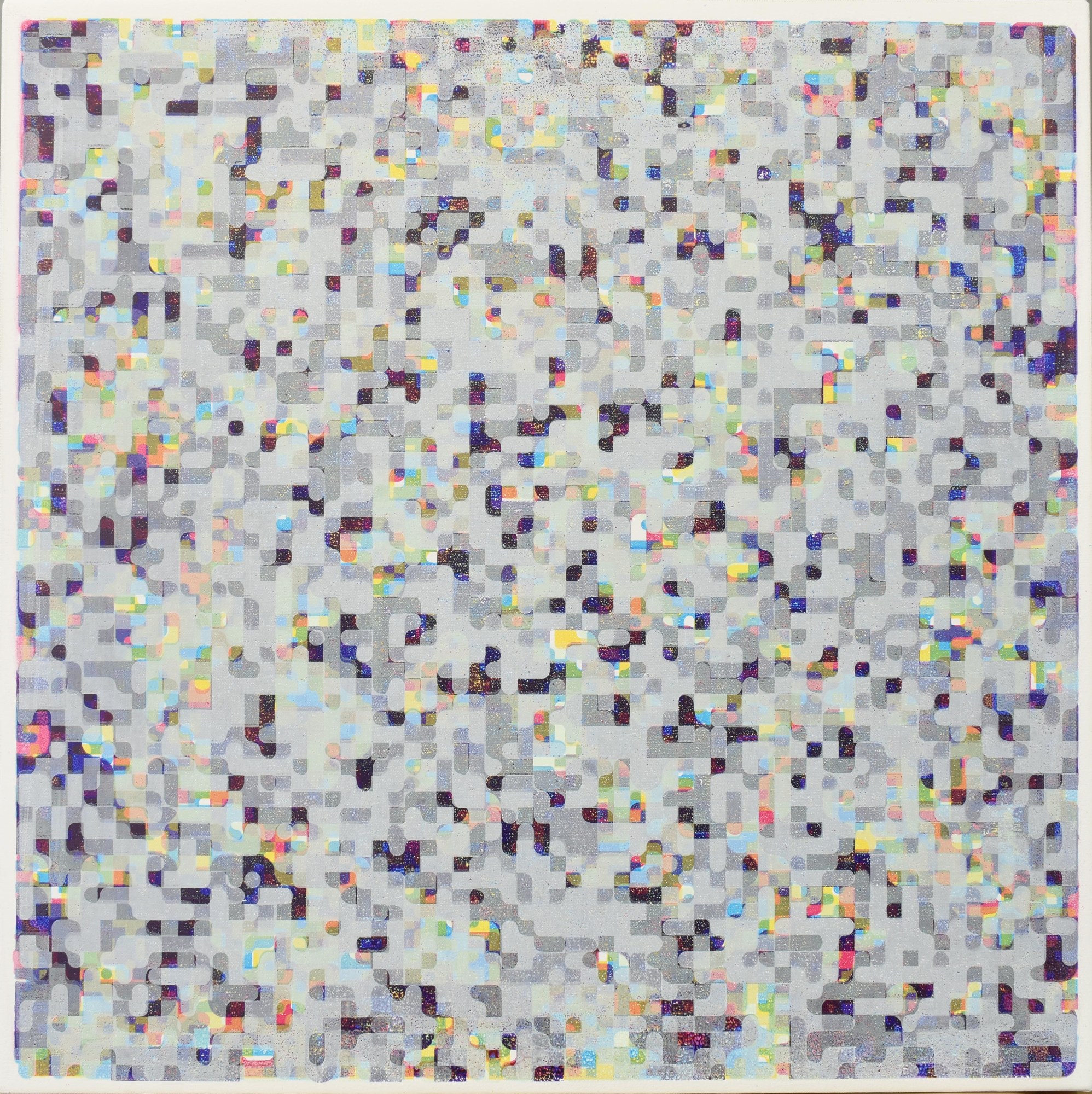 First of a series of works investigating the idea of the 'Simulacrum', through the specific signs of making. Simulacrum 1 is a layered screen print borrowing the conventions of painting, questioning perception of value. Screens made are developed from algorithms, the output of a specially made program.