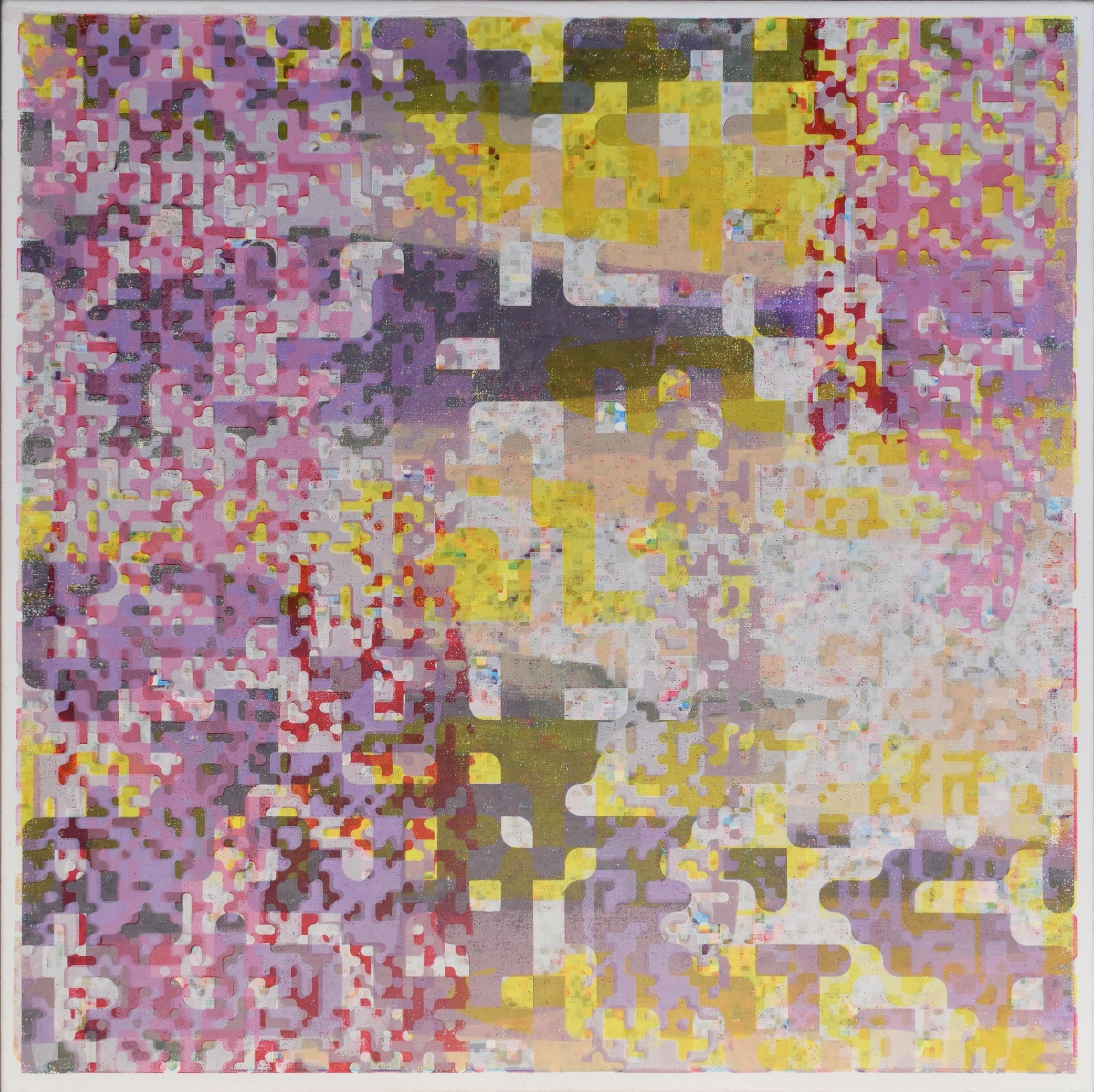 The second of a series of works investigating the idea of the 'Simulacrum', through the specific signs of making. Simulacrum 2 is a layered screen print borrowing the conventions of painting, questioning perception of value. Screens made are developed from algorithms, the output of a specially made program. Textile inks on a highly prepared sanded gesso, archival fixative protected.