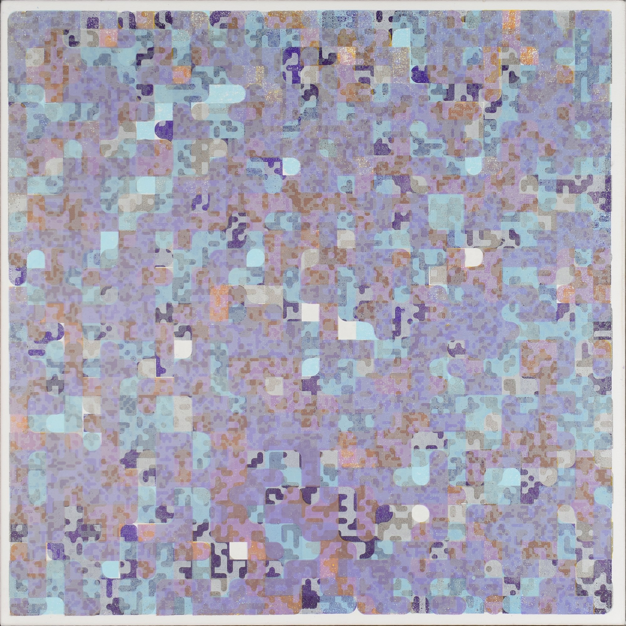Sixth of a series of works investigating the idea of the 'Simulacrum', through the specific signs of making. Simulacrum 6 is a layered screen print borrowing the conventions of painting, questioning perception of value. Screens made are developed from algorithms, the output of a specially made program.