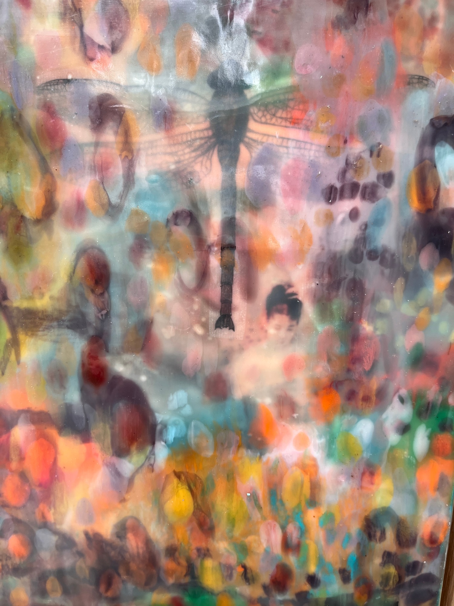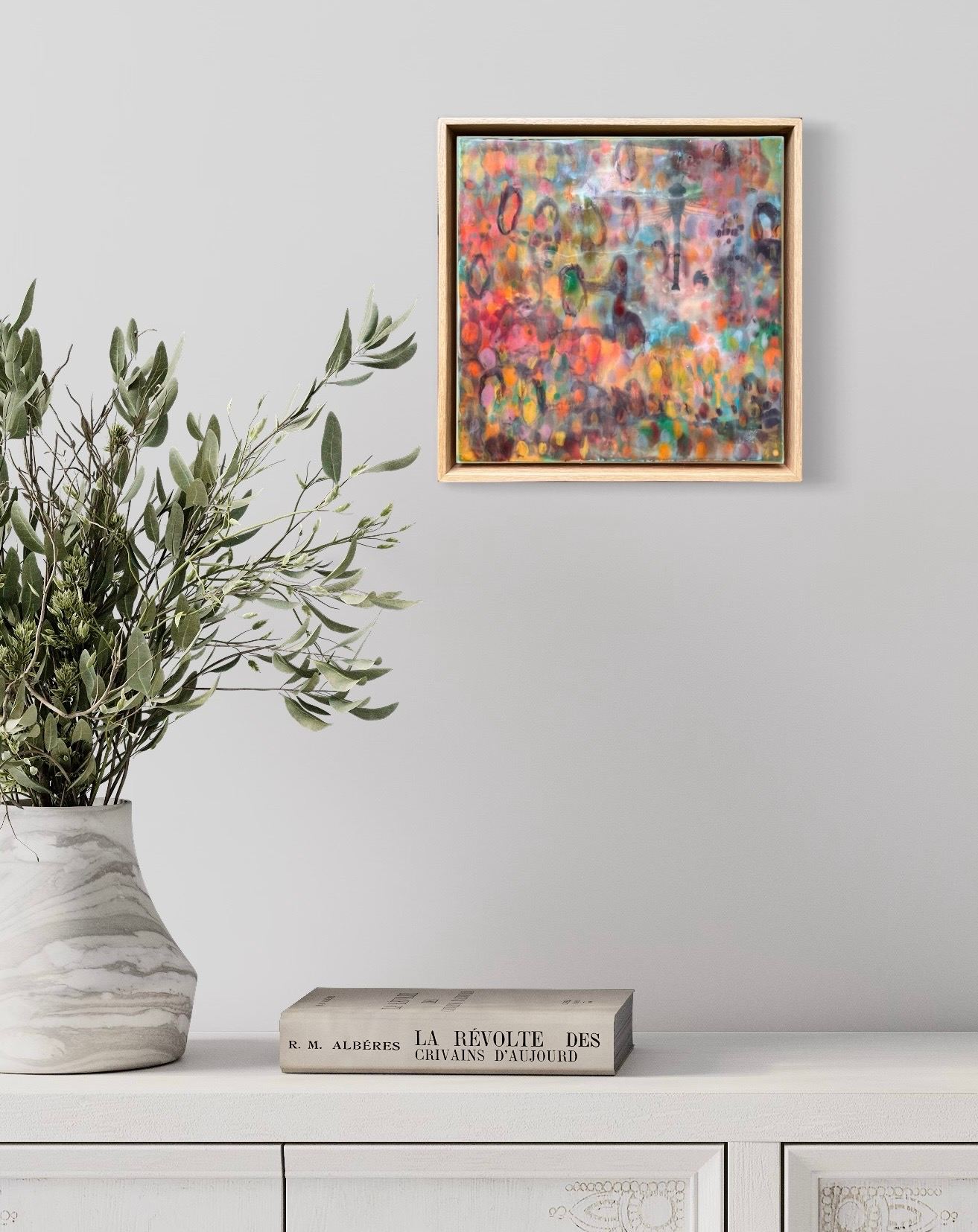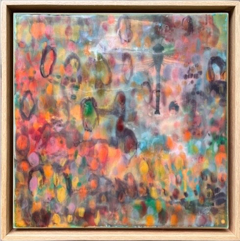 Mixed Media : Solid Encaustic Wax, Collage & Transfer on Wood, Oak Framed