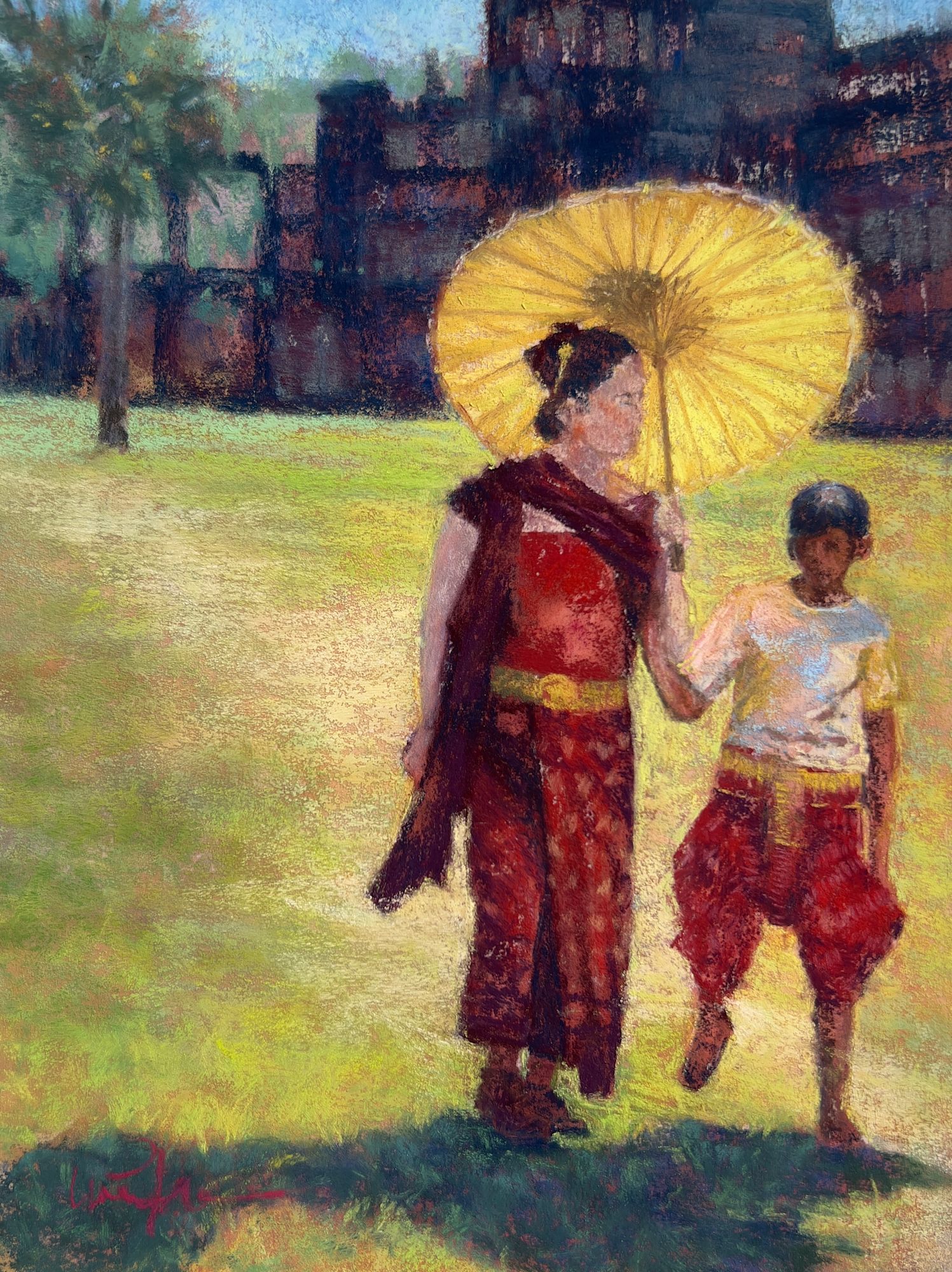 While visiting Anchor Wat in Cambodia this woman and boy in traditional Cambodian attire appeared and for an instant I was transported back in time. To best represent the ethereal feeling I had when viewing this couple on site, I chose to let much of the underpainting show through as a ghost image and to keep the details at a minimum. As I continue to cherish this piece I'm often wondering what they might of have been talking about, and sometimes even if they were there at all.