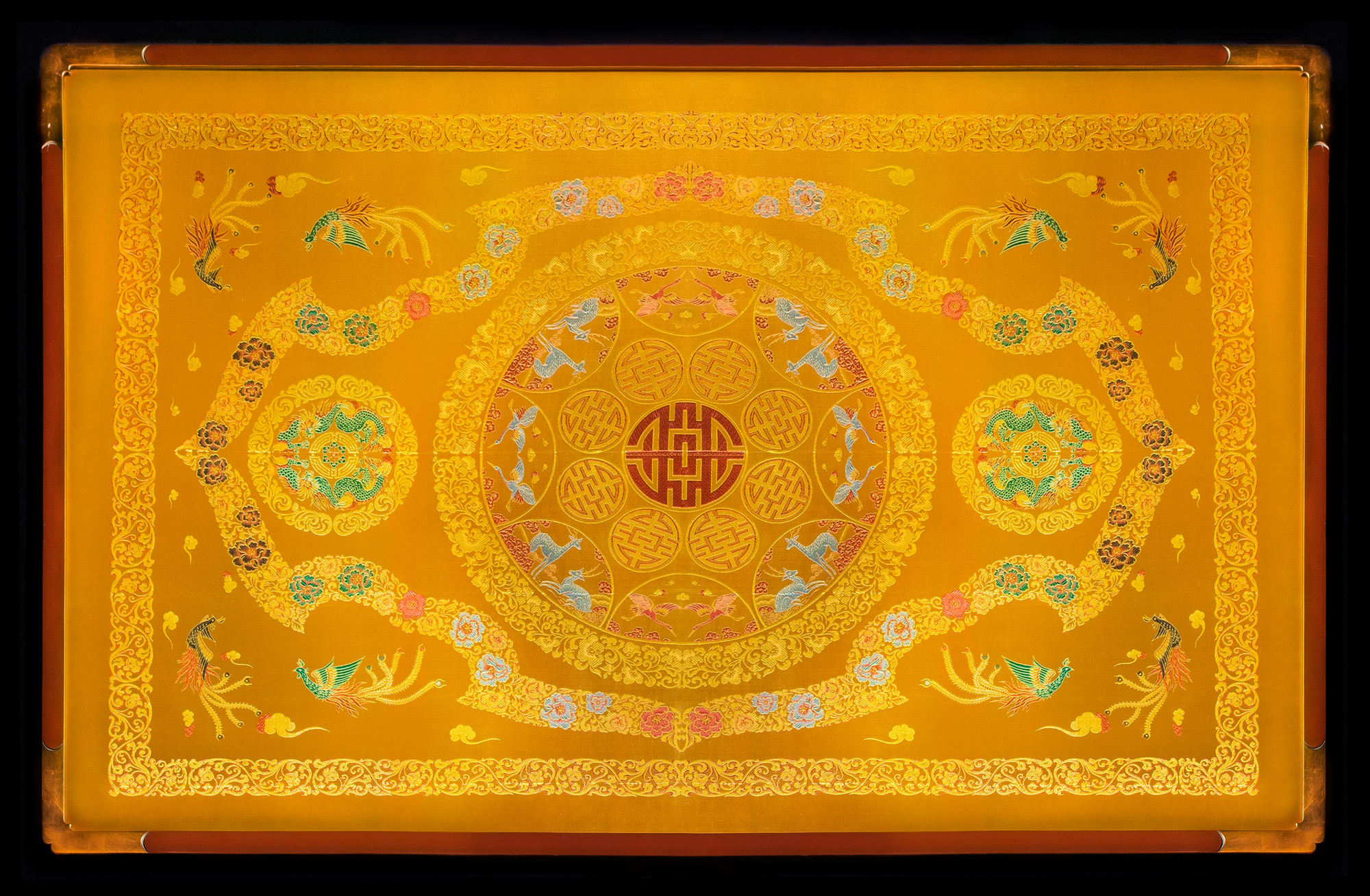 This Japanese Buddhist altar cloth from the 19th Century, known as an uchishiki, is made of finely woven silk brocade. It was originally purchased by Col. and Mrs. Raymond H. Gehrig, in Kyoto, Japan and given to the Bates' in December, 1951.