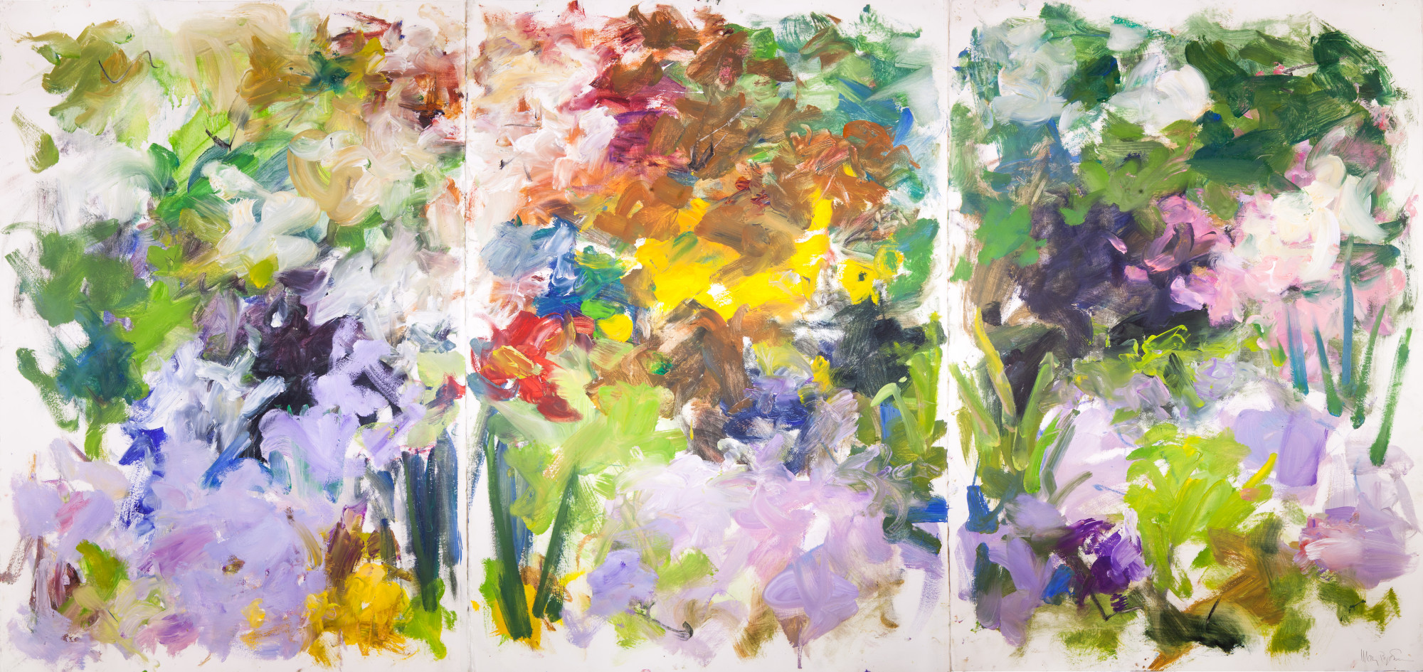 Mary Page Evans creates her works directly from nature and works in a loose style that relies on color to determine the structure of her compositions. This particular style was modeled after the teachings of historical painters Cezanne and Hans Hofmann. This floral landscape was painted while the artist was in Arden, Delaware.
