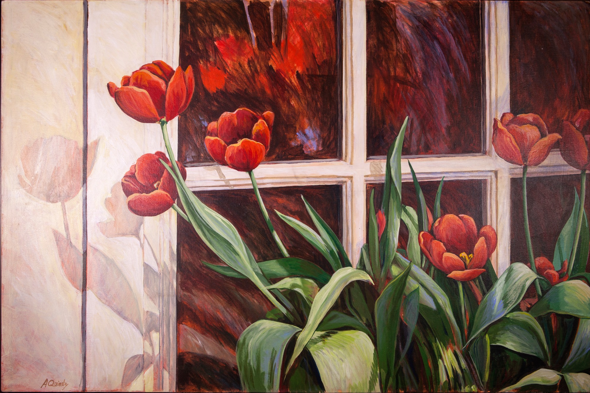 Using a heavy application of paint and dynamic usage of shadow and light, Adele Quimby captures the arrogant growth of tulips on a windowsill.