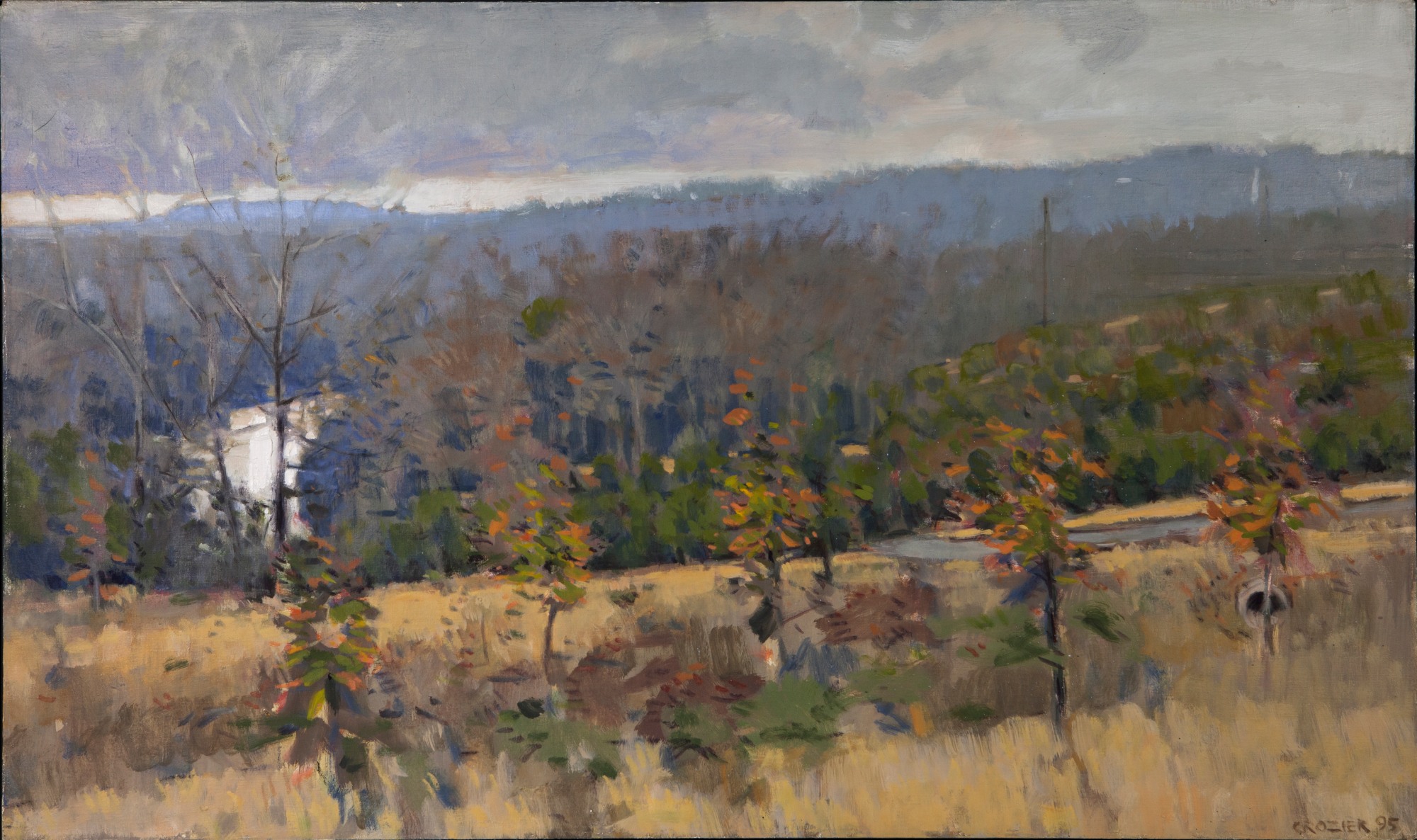 Richard Crozier’s paintings do not rely on photographs or preliminary sketches but are painted directly from life. Some of his work, particularly his landscapes, were painted by Crozier in his parked car. His landscapes are painted from various locations including Charlottesville, Crozet, Waynesboro and the surrounding counties. This painting was by the artist overlooking the river towards Thomas Jefferson's Monticello Plantation.