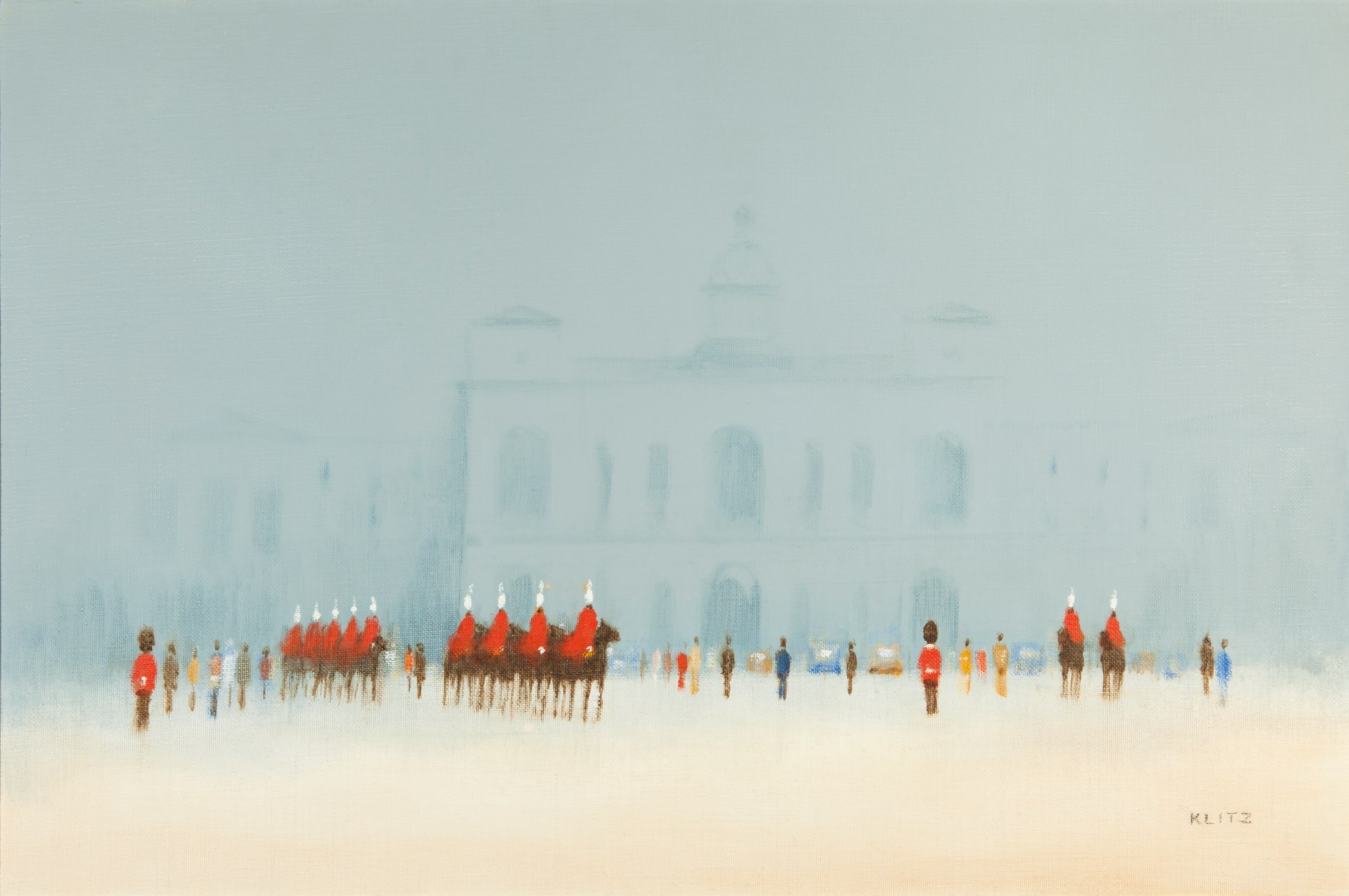 Klitz was a prolific painter, specializing in London cityscapes, and formal military scenes. He was admired by critics for his “…masterly reproduction of London’s watery light” using his subtle color pallet and his delicate application of oil paints. This painting depicts a military parade in front of the Horse Guards Building in London, England. The building was designed by William Kent in 1751 after the demolition of the original at Westminster palace. The building is the formal entrance to St James's Palace and as of 1906 it became the headquarters of two major Army commands: the London District and the Household Cavalry. The Horse Guards building is also the location of the Official Household Cavalry Museum.