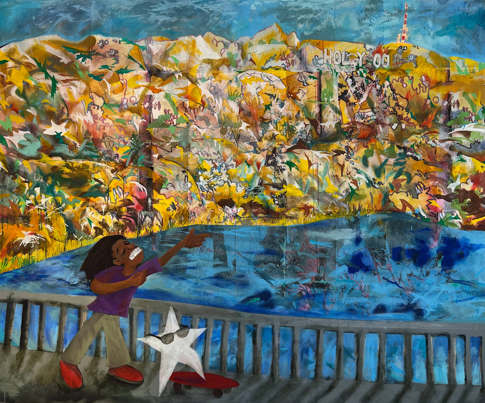 In "They Don’t Make Sh*t Like They Used To (the Hills)," I revisit the reservoir below the Hollywood sign in Los Angeles, a place tied to my childhood memories. The painting is dense yet playful, reflecting on my hopes, dreams, and the vision I had of my potential and future. In this piece, I photo-transfer digital images from my sketchbook onto the canvas, layering acrylics to create a textured, tactile expression. This process brings the 2D digital world into the 3D realm of my fine art practice, merging memory and medium. It’s an exploration of how I navigated through a sea of dreamers, working to carve out my own unique path.