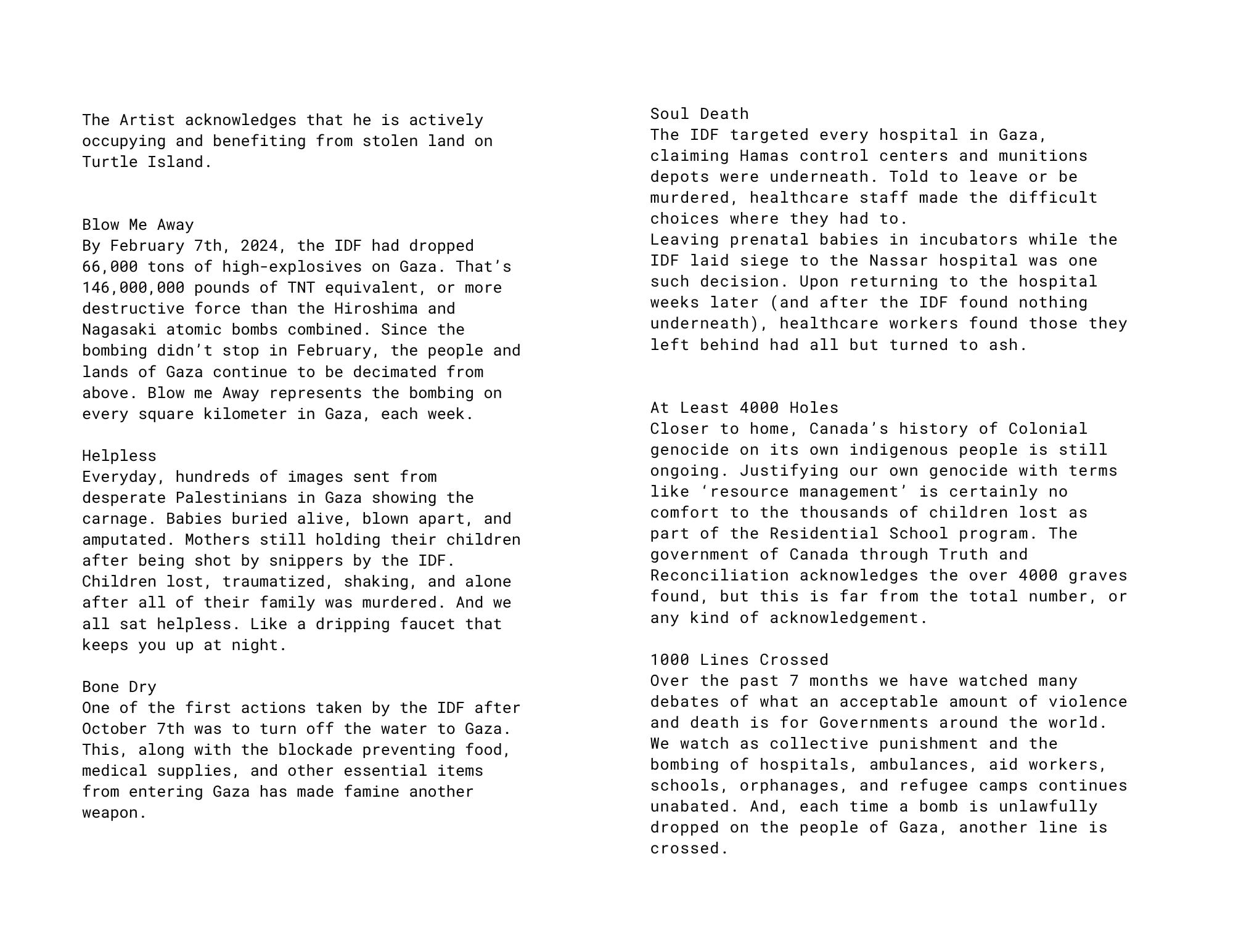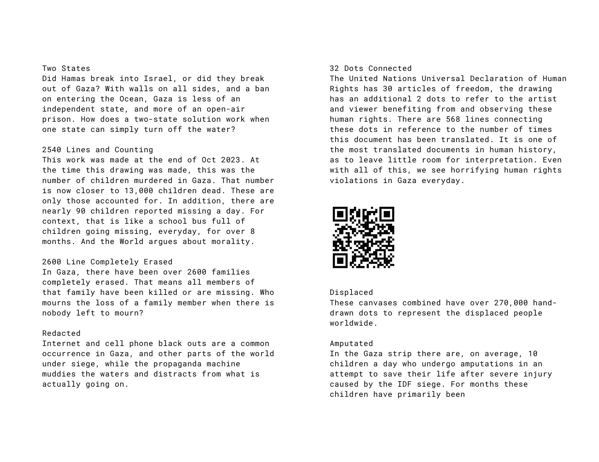 This is the Booklet that accompanies the exhibition to explain and describe the work from the show 'Dots, Lines and some Violence'. The statistics quoted are as of March 2024