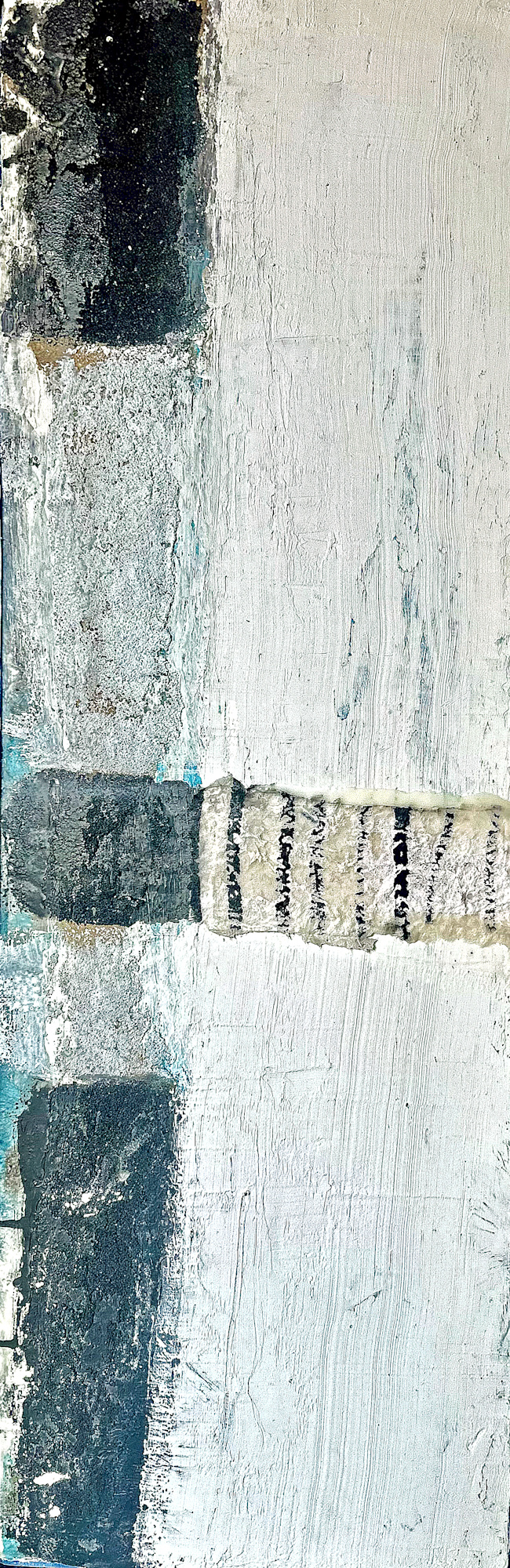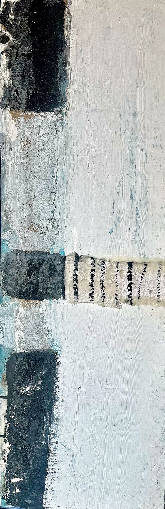 MessageThe artwork consists of a vertical composition predominantly painted in shades of white and grey. There are four prominent horizontal blocks of black mixed with grey textures on the left side of the canvas that extend into the central area. The central vertical section features a textured area with alternating dark stripes. The overall style is abstract, with various brushstrokes and textures giving a sense of depth and complexity to the piece.