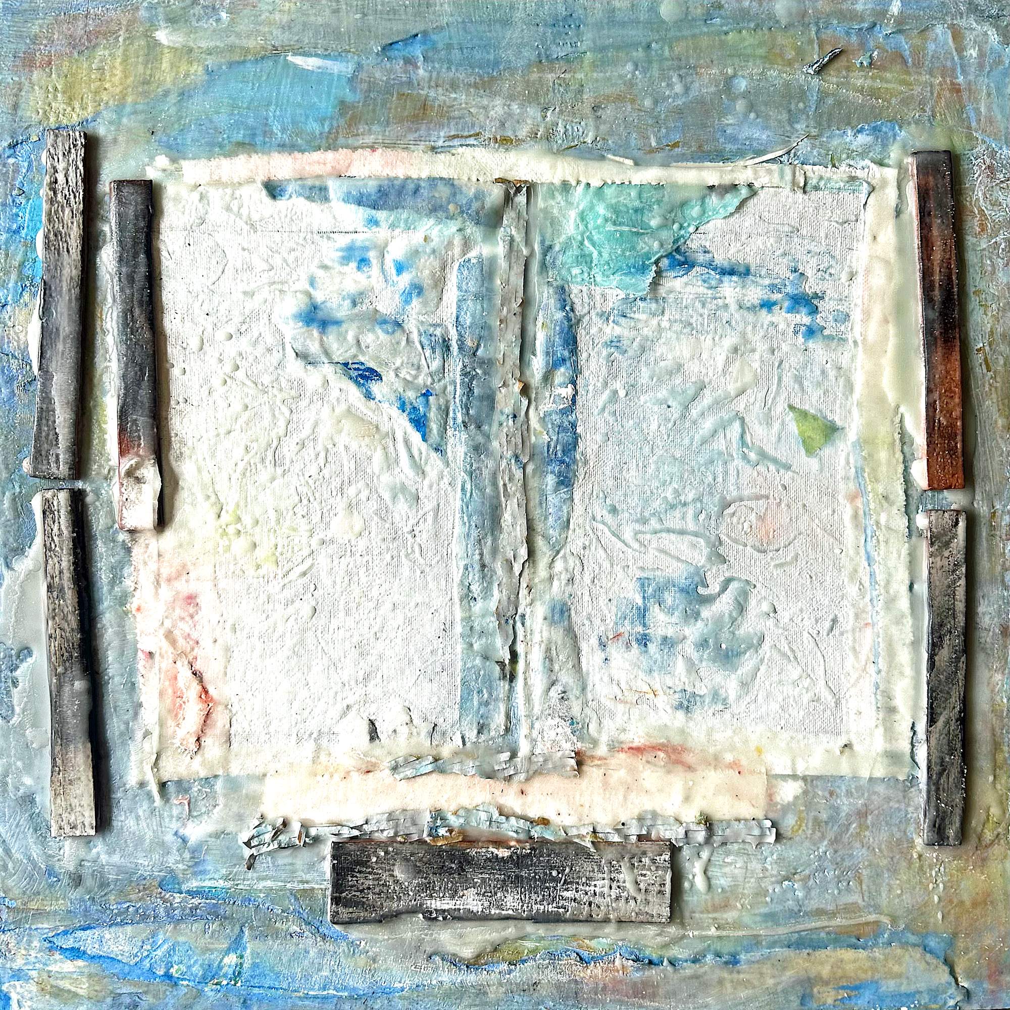 MessageI'm excited to share my new artwork, "Old Window," with you. This piece is a textured and abstract representation of wall , capturing the essence of color, texture, and human history. I used an intriguing combination of encaustic with a fresco substrate and wood fragments to bring this vision to life. The mixed media brushstrokes in shades of blue, green, and hints of orange, along with the vertical and horizontal wooden-like elements, give it a unique three-dimensional quality. Creating this piece allowed me to explore the intersection between old surfaces and modern artistic expression, culminating in a work that I hope resonates with both old architecture and art enthusiasts alike. Stay tuned for more insights and behind-the-scenes looks at the process.