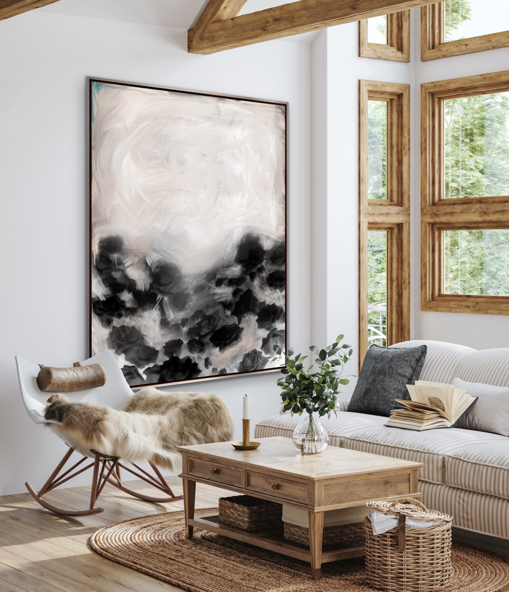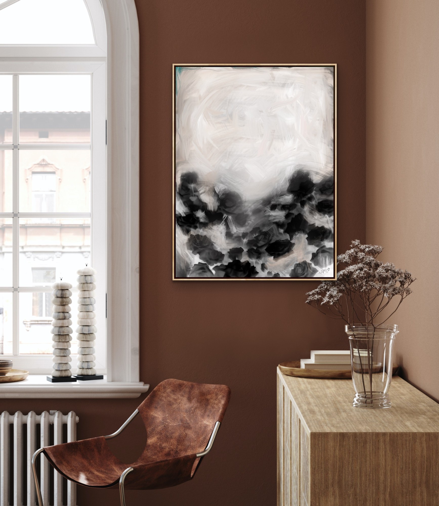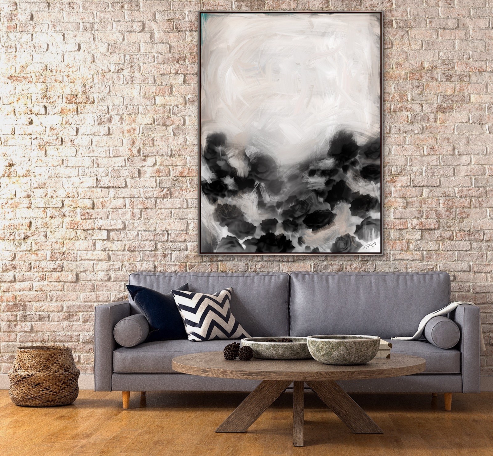 Oil on canvas piece, portraying monochromatic abstract beauty. Delicate roses emerge from dark depths, symbolizing resilience and the ability to rise above challenges. The artwork invites reflection on inner strength and the beauty found in overcoming adversity.