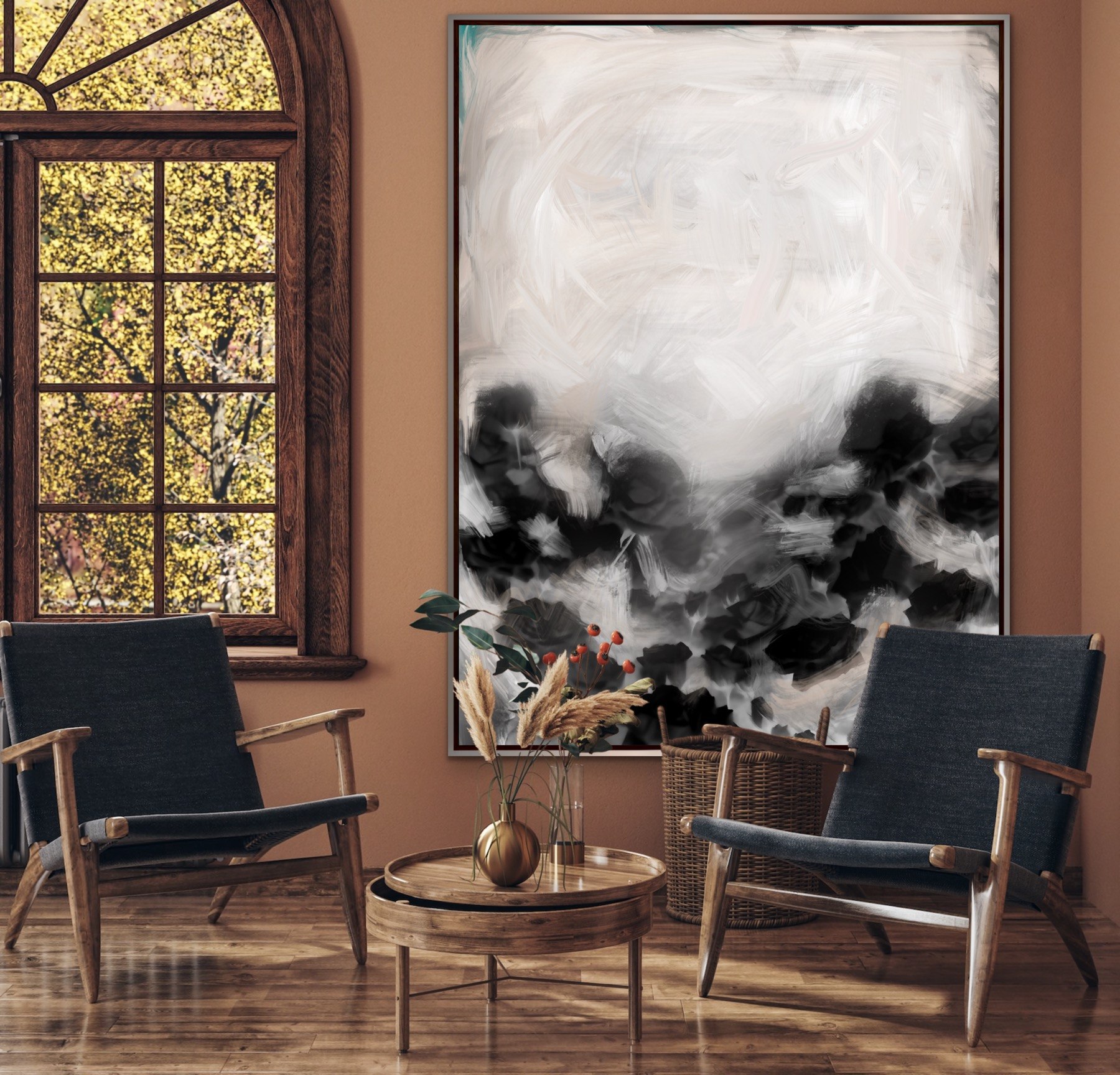 Oil on canvas piece, portraying monochromatic abstract beauty. Delicate roses emerge from dark depths, symbolizing resilience and the ability to rise above challenges. The artwork invites reflection on inner strength and the beauty found in overcoming adversity.