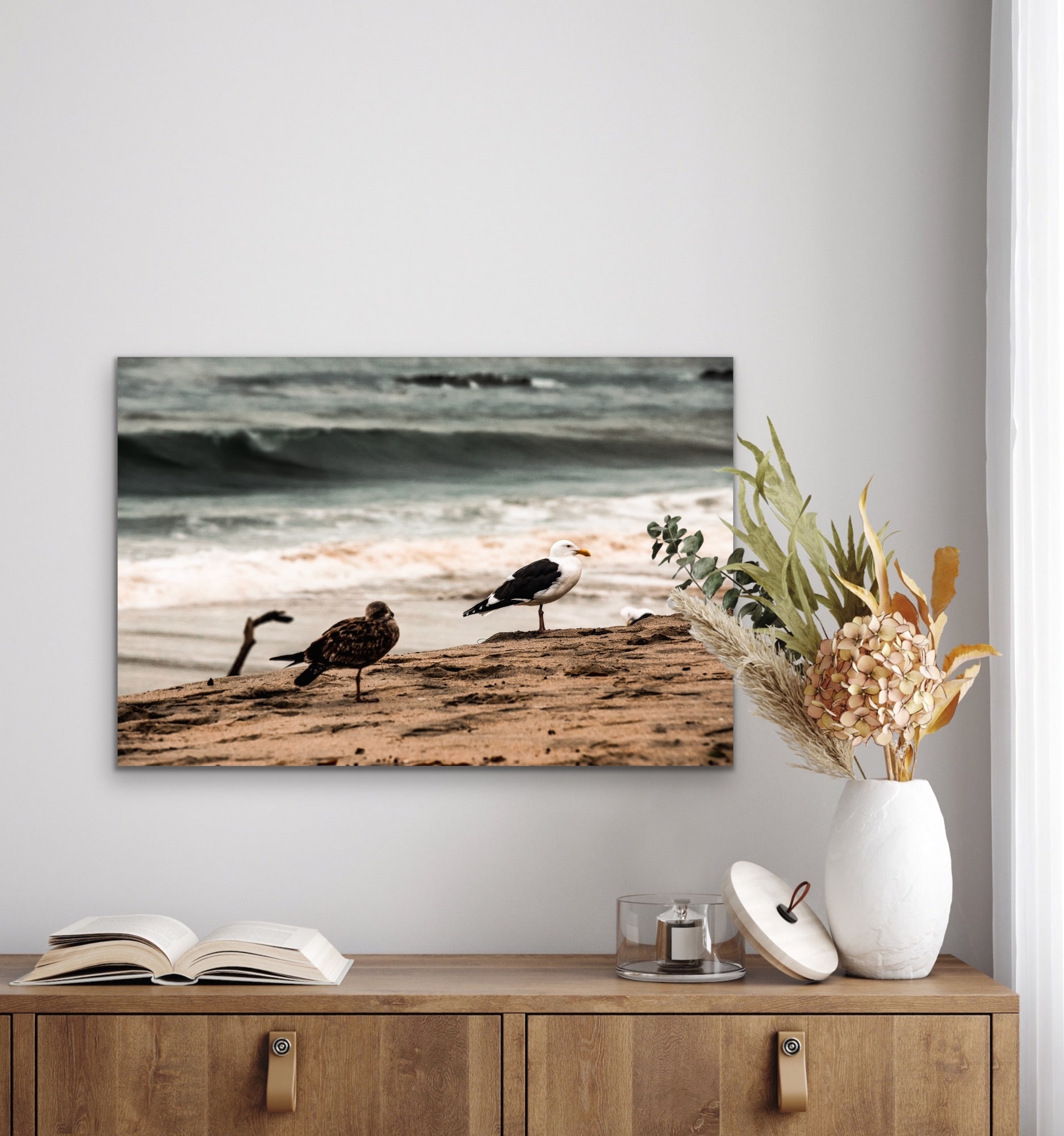 The enchanting allure of avian life along the sandy shores. Against the backdrop of the vast ocean expanse, delicate seabirds grace the beach with their presence, their graceful movements painting the air with a sense of tranquility and freedom