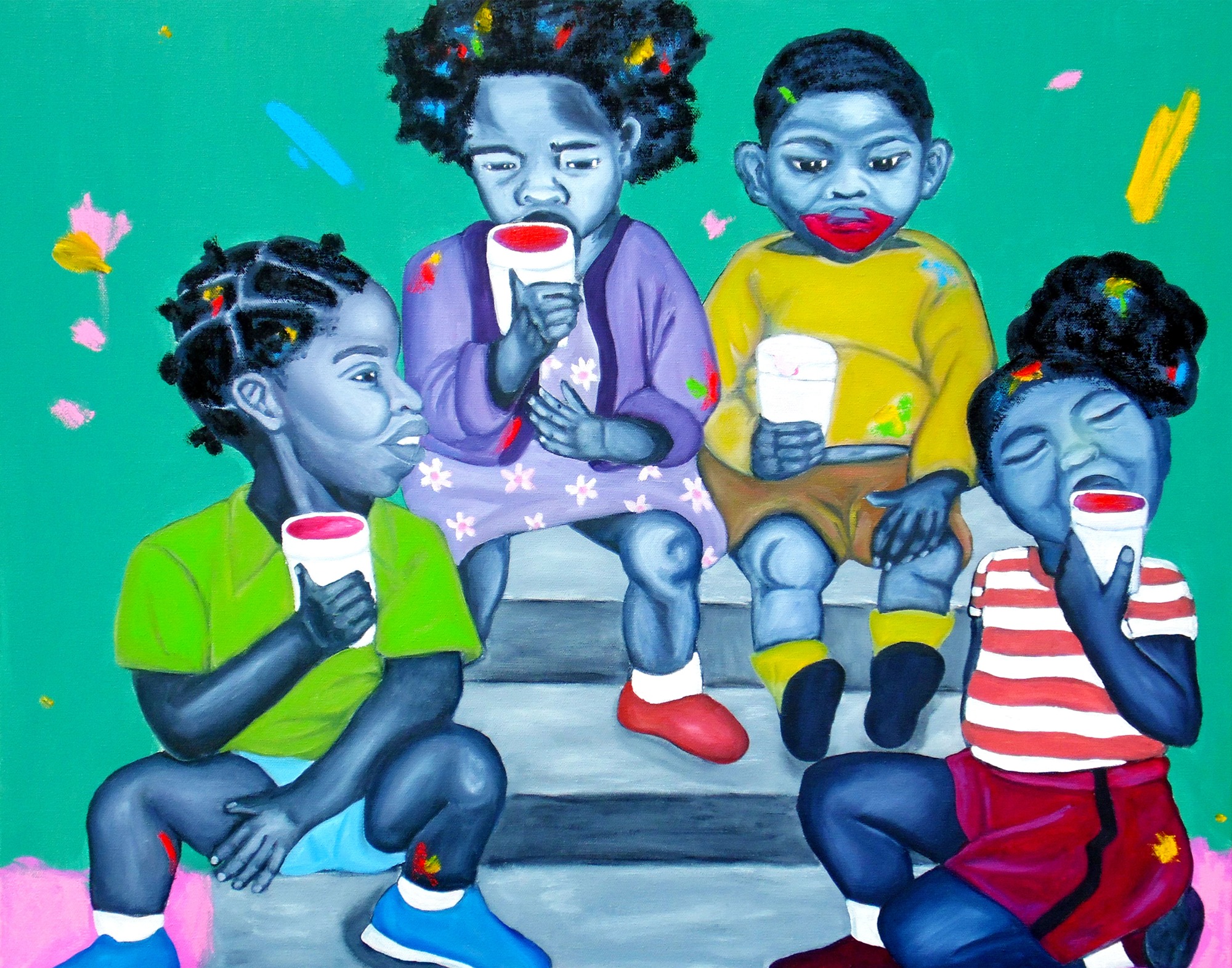 Where I’m From, We Call ‘Em Huckabucks is 1 of 12 original pieces created as part of the collection, Restorative Joy: Recollecting Black Innocence. The collection was started in 2020, and is a counter response to the negative imagery and narratives associated with black and brown bodies.