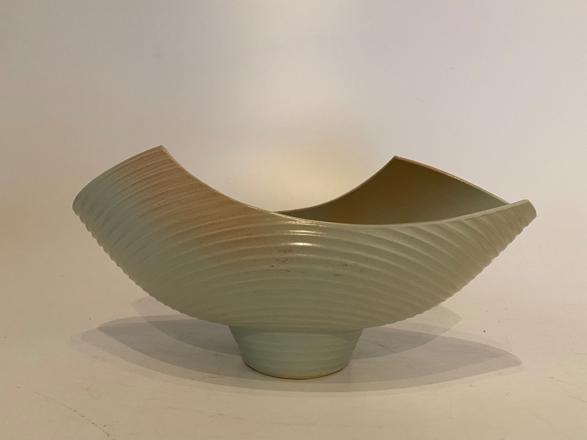 Ceramic ikebana vase featuring a light blue and pink glaze, with an asymmetrical, wavy rim and adorned with horizontal, curved relief lines.