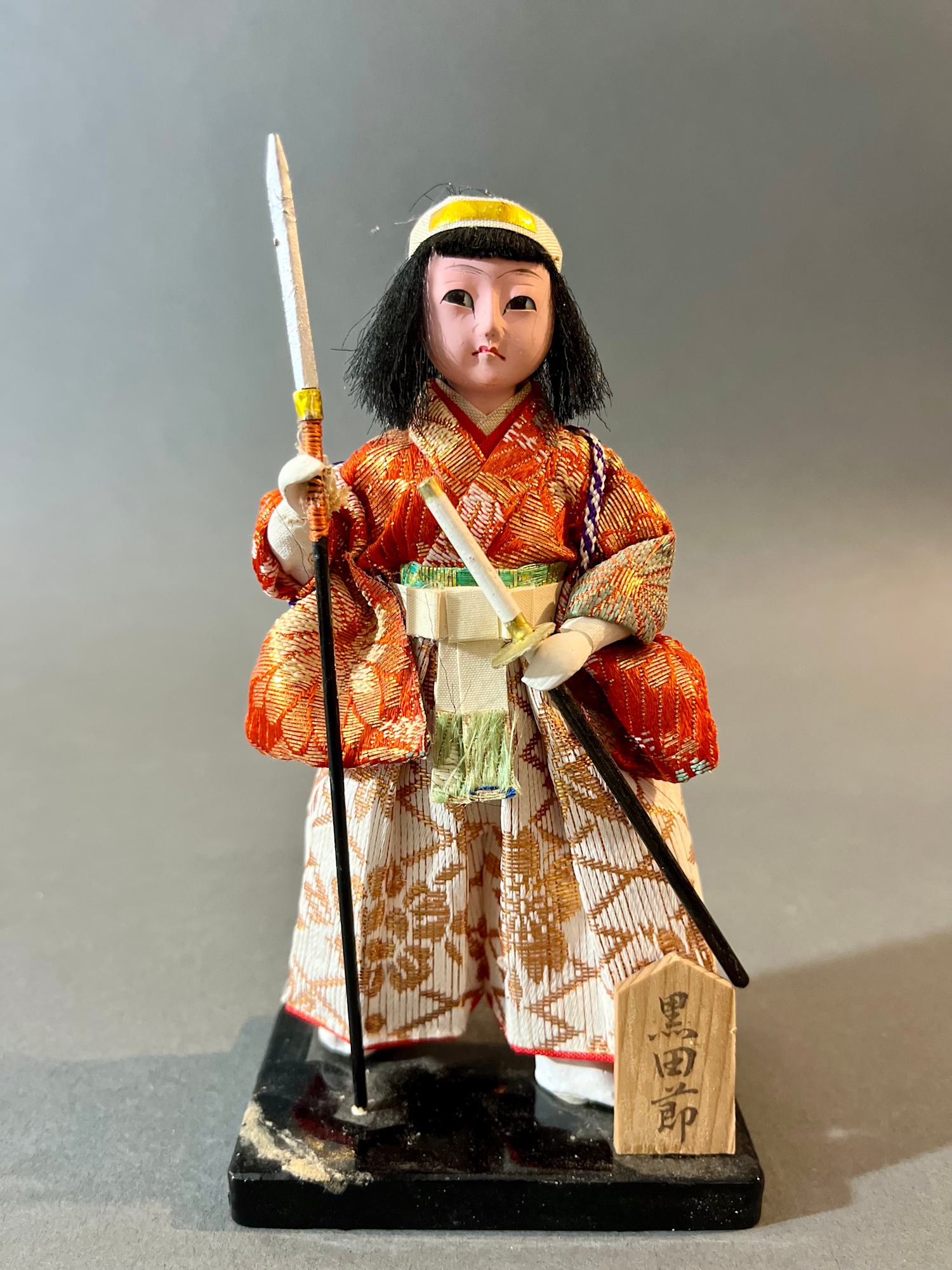 Doll depicting a boy holding a sword and spear, mounted on a wooden stand.