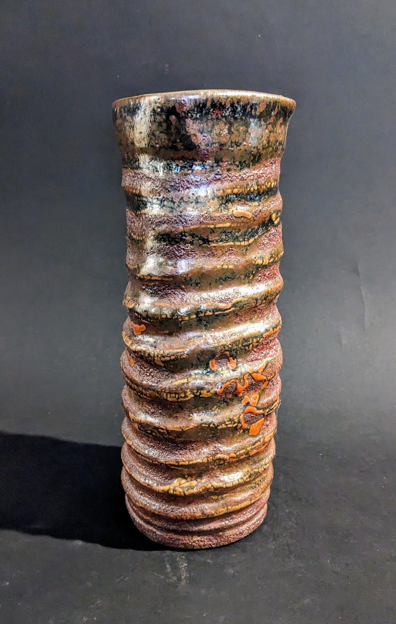 Cylindrical ceramic ikebana vase, featuring a brown to rust-red metallic glaze, with accent of orange and black, and encircling horizontal bulging bands.