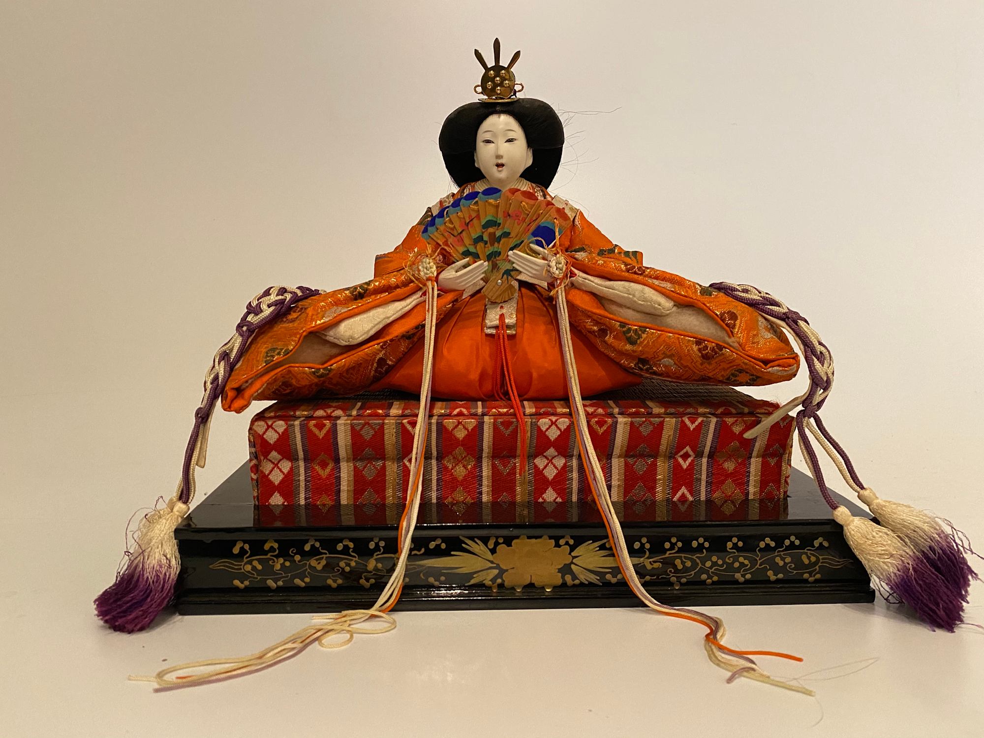 Ohina-sama doll from a set of hina ningyō (Girl’s Day dolls). This figure is one of the Dairi-bina, the imperial couple representing the Emperor and Empress, traditionally displayed on the uppermost tier of the tiered hina dan. As the central figures in the ensemble, they hold the highest symbolic significance within the Hinamatsuri festival display. It comes with a two piece 3.25"x12"x8.25" base.