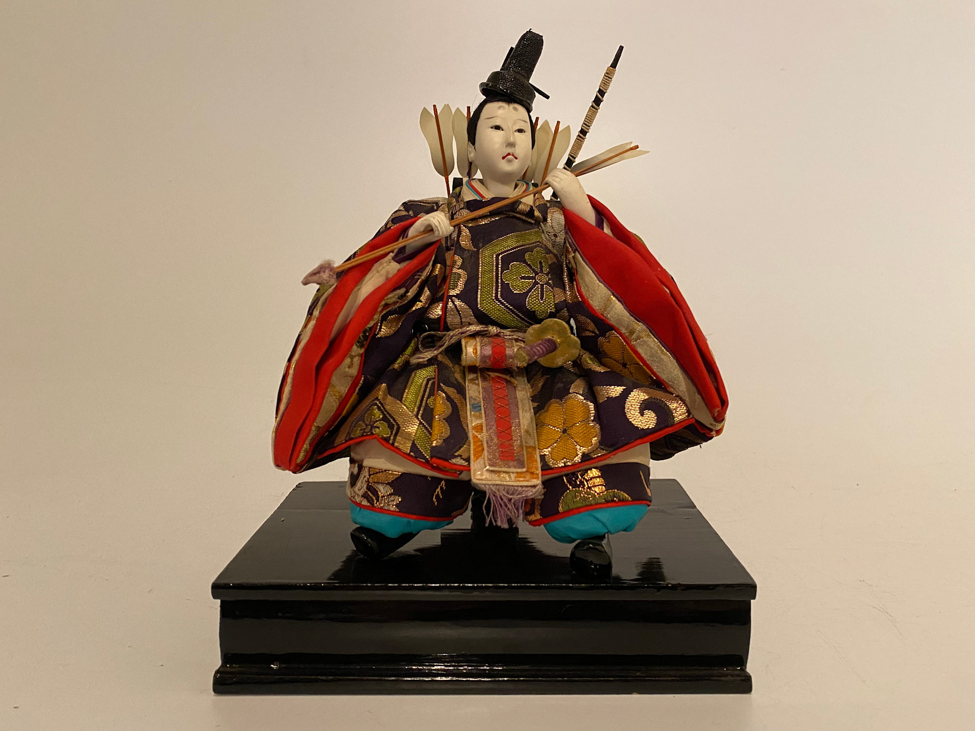One of a pair of court guardians from a hina ningyō (Girl’s Day doll) set, representing the zuijin—the imperial retainers charged with the protection of the Emperor and Empress. This figure embodies the ukon-e or ‘Minister of the Right.’ Traditionally depicted as a youthful courtier, he embodies vitality, loyalty, and military prowess in service to the imperial household. Like his counterpart, the Minister of the Left, he is equipped with bow and arrows, reinforcing his role as a vigilant protector of the emperor and empress. Together, the ministers symbolize a balanced guardianship—age and youth, wisdom and strength.
