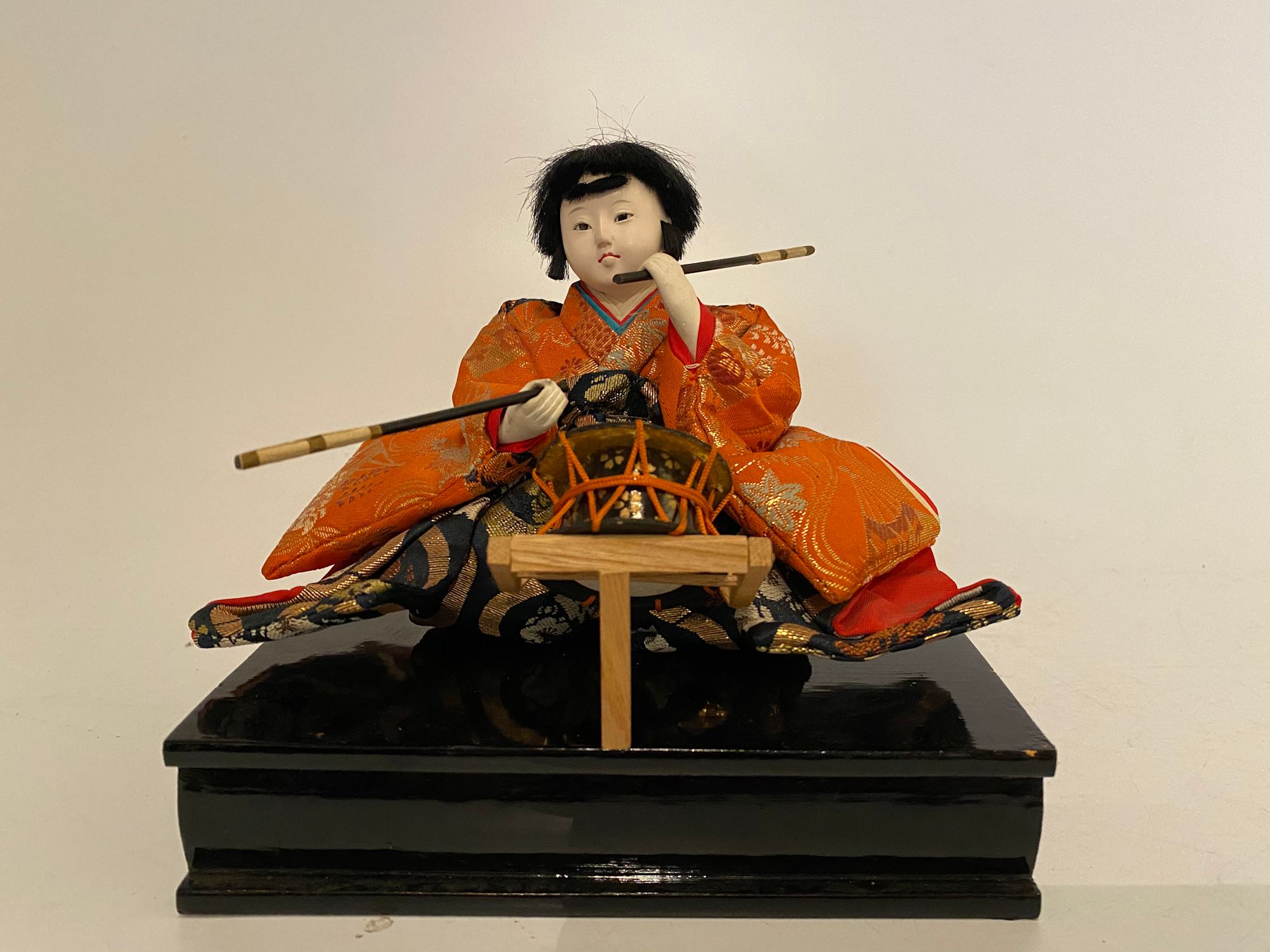 One of five male court musicians from a hina ningyō (Girl’s Day doll) set known as the gonin-bayashi. Arranged to reflect the traditional configuration of musical accompaniment in Noh theater, each figure represents a distinct instrumental role. This doll depicts the taiko drummer, identified by his seated posture and the placement of his instrument.