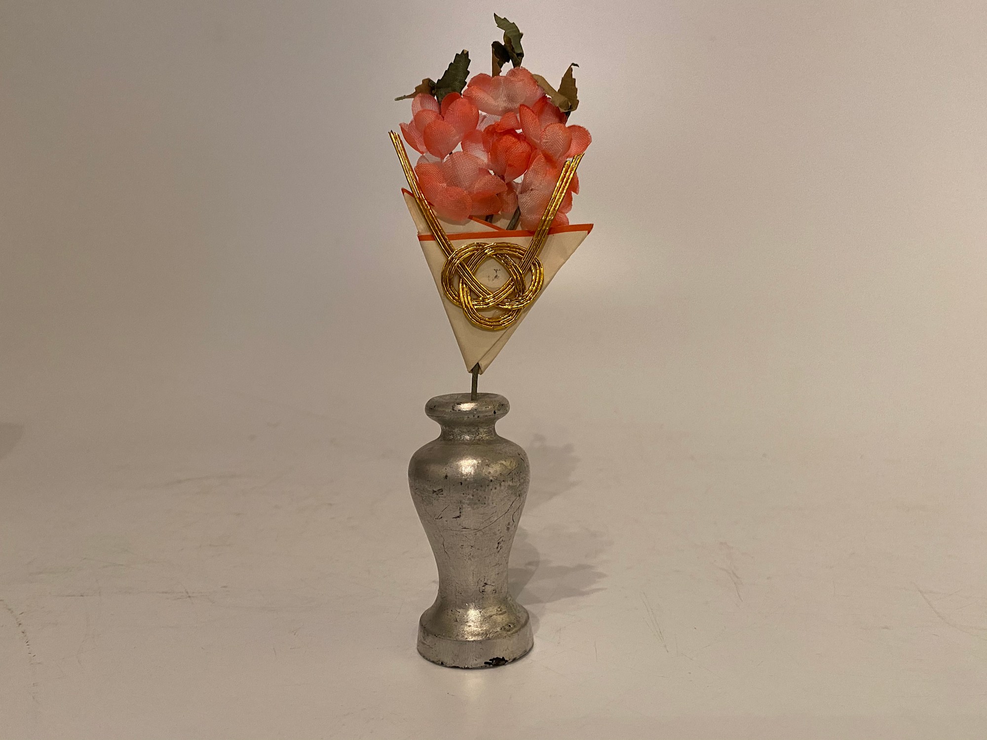 Vase adorned with flowers, positioned between the emperor and empress figures, from a collection of hina ningyō (Girl's Day dolls).