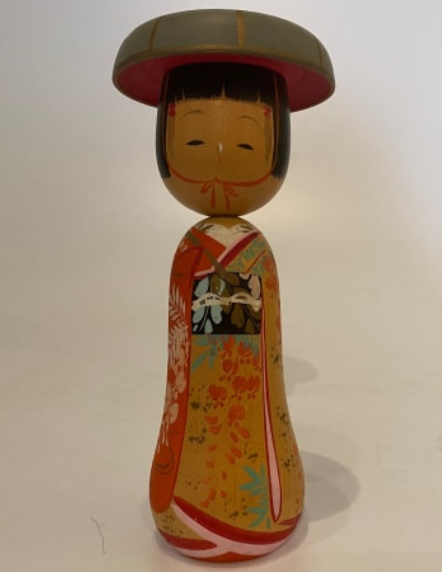 Vintage kokeshi doll adorned with a large hat. The artist's signature is inscribed on the base of the figure.