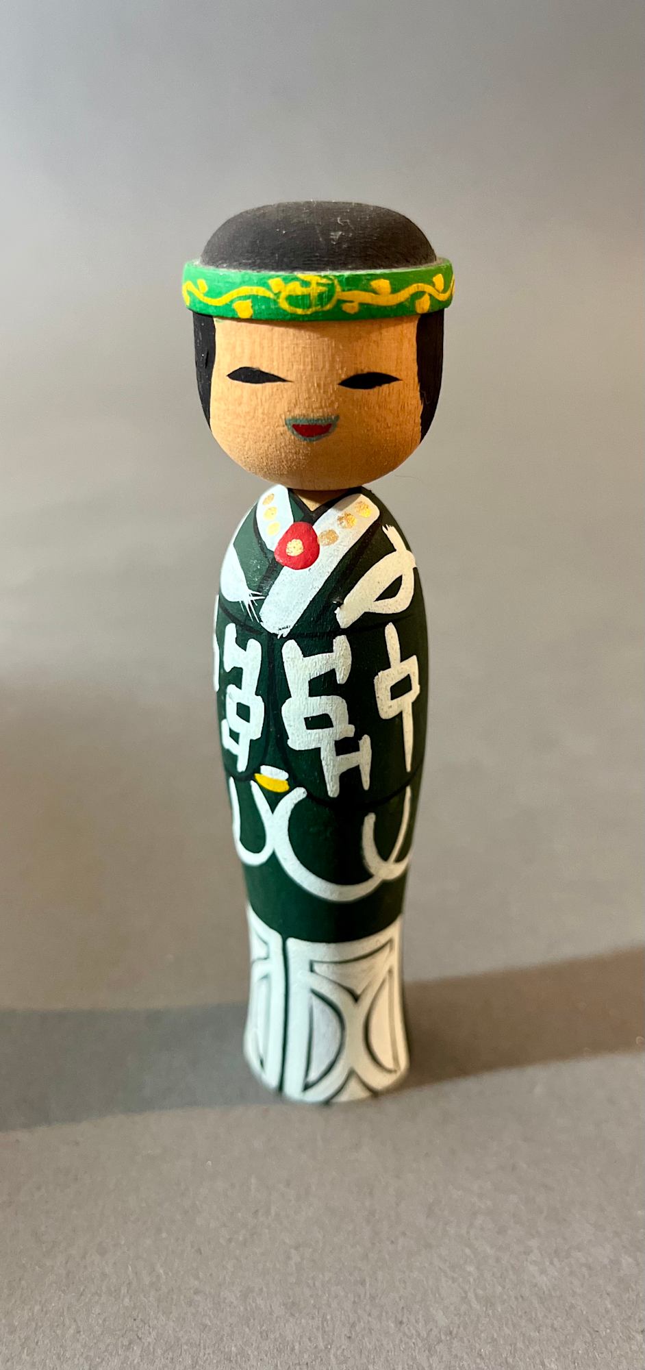 Vintage kokeshi doll exhibiting stylistic influences from Ainu artistic traditions, reflecting a synthesis of cultural motifs.