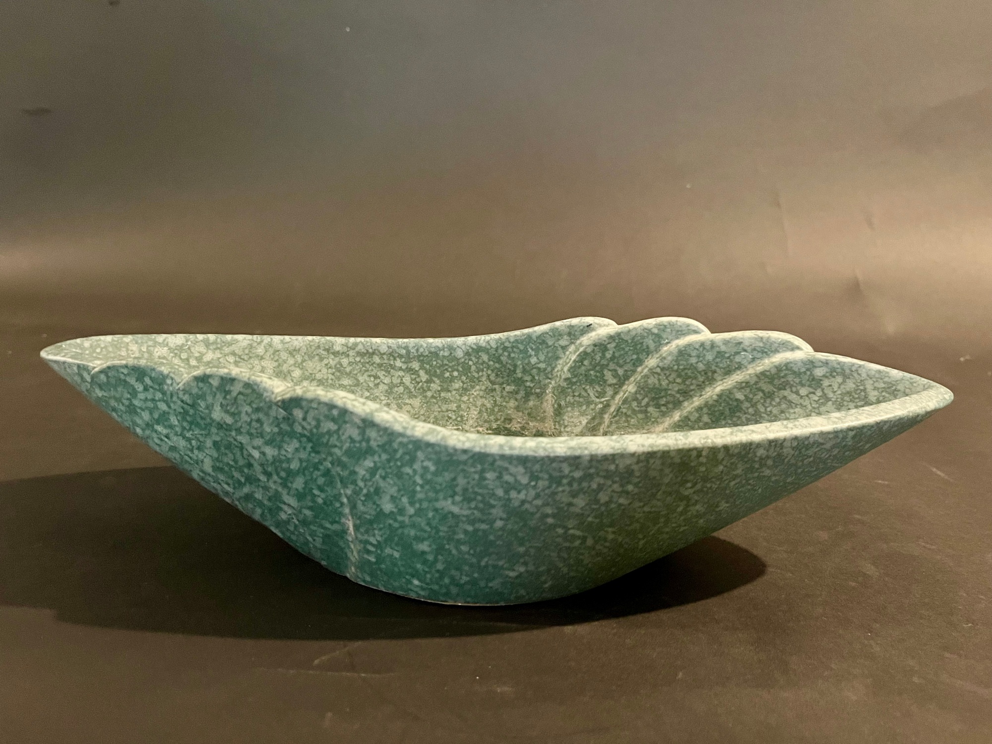 Leaf-shaped green ceramic ikebana vase with partially scalloped rim.