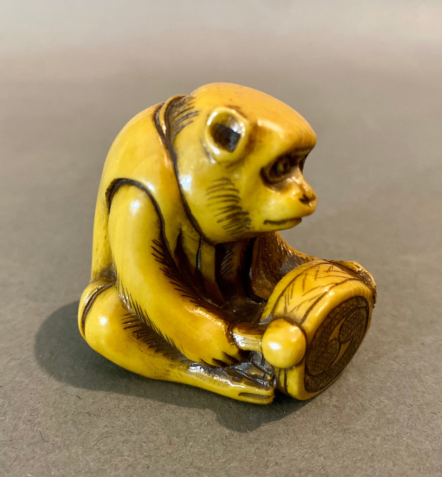 Netsuke depicting a monkey seated in a playful pose, rhythmically beating a drum, executed in stained ivory.
