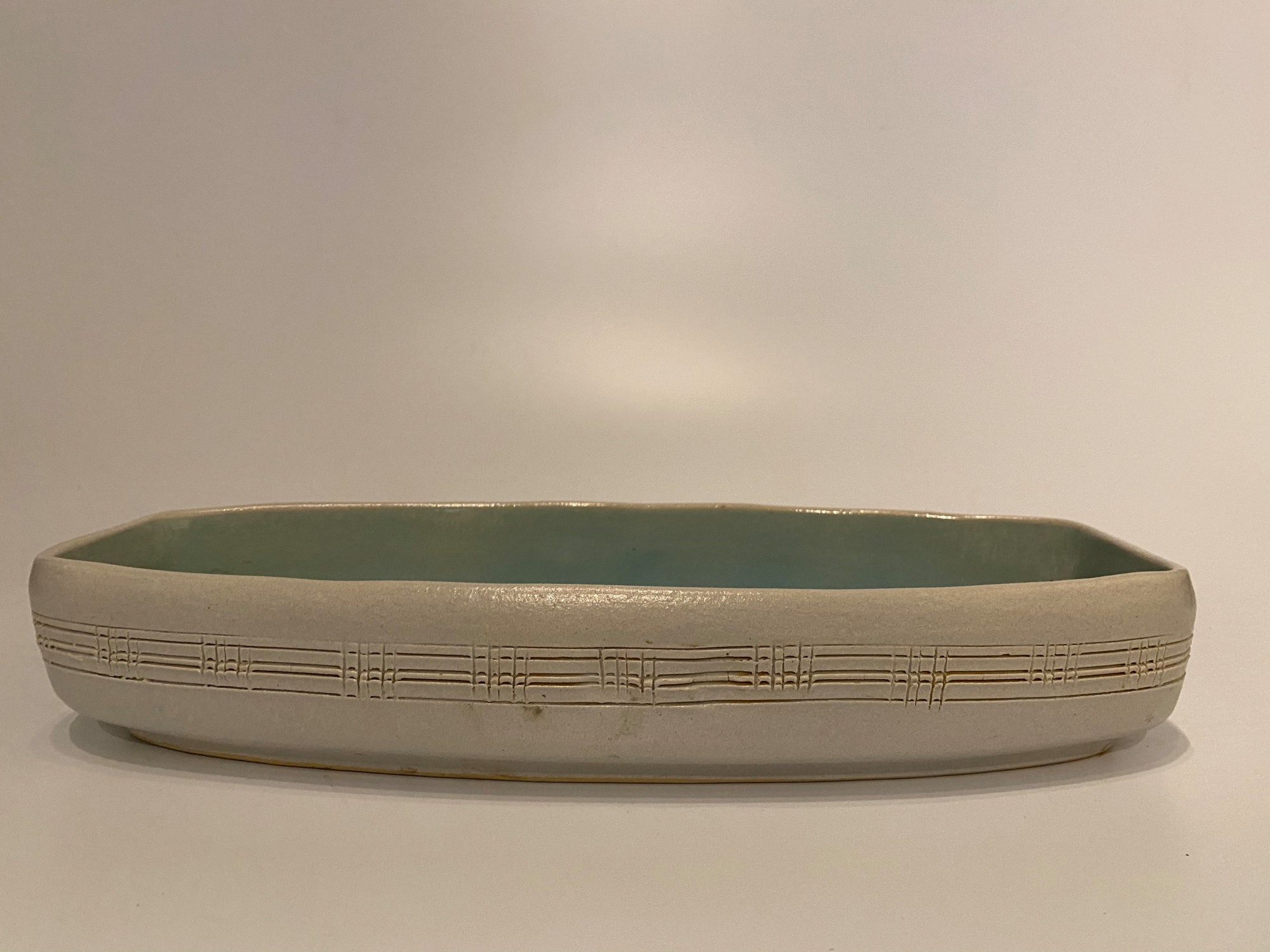 Shallow ceramic ikebana vase with a gray exterior and light blue interior, featuring an incised geometric line pattern.